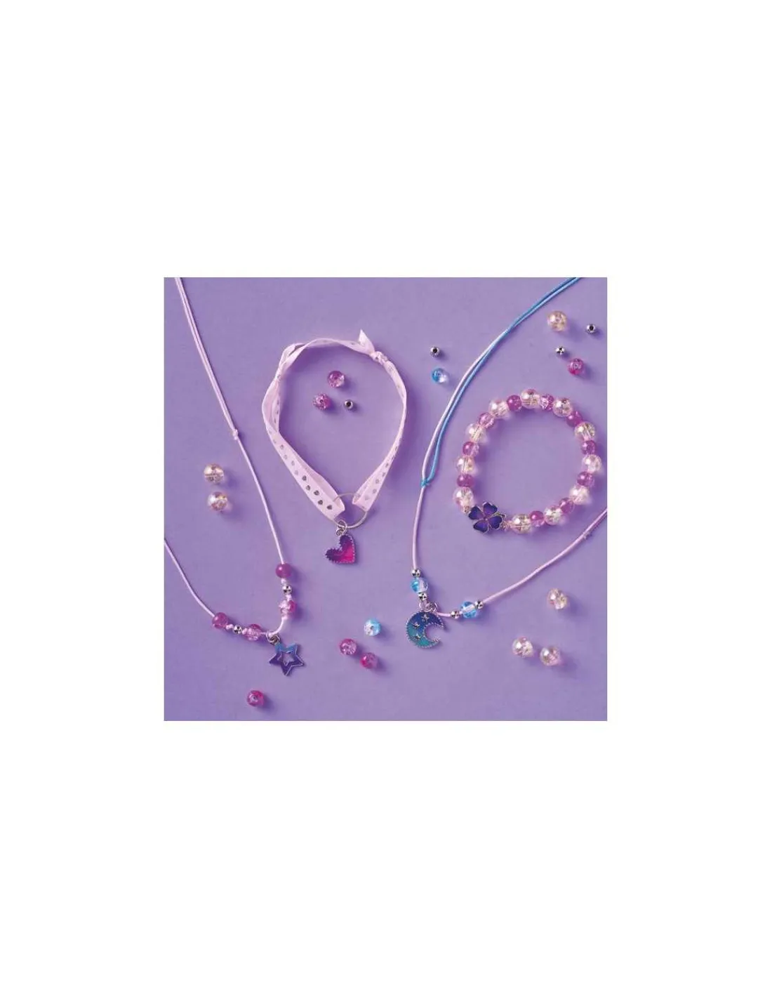 Ce coffret ludique contient tout le nécessaire pour réaliser 2 colliers et 2 bracelets : 4 breloques spectaculaires en forme de lune, cœur, trèfle et étoile, qui émerveilleront par leurs changements de couleur, ainsi que des perles scintillantes et colorées (11 pailletées, 16 roses, 2 bleues et 6 argentées).
