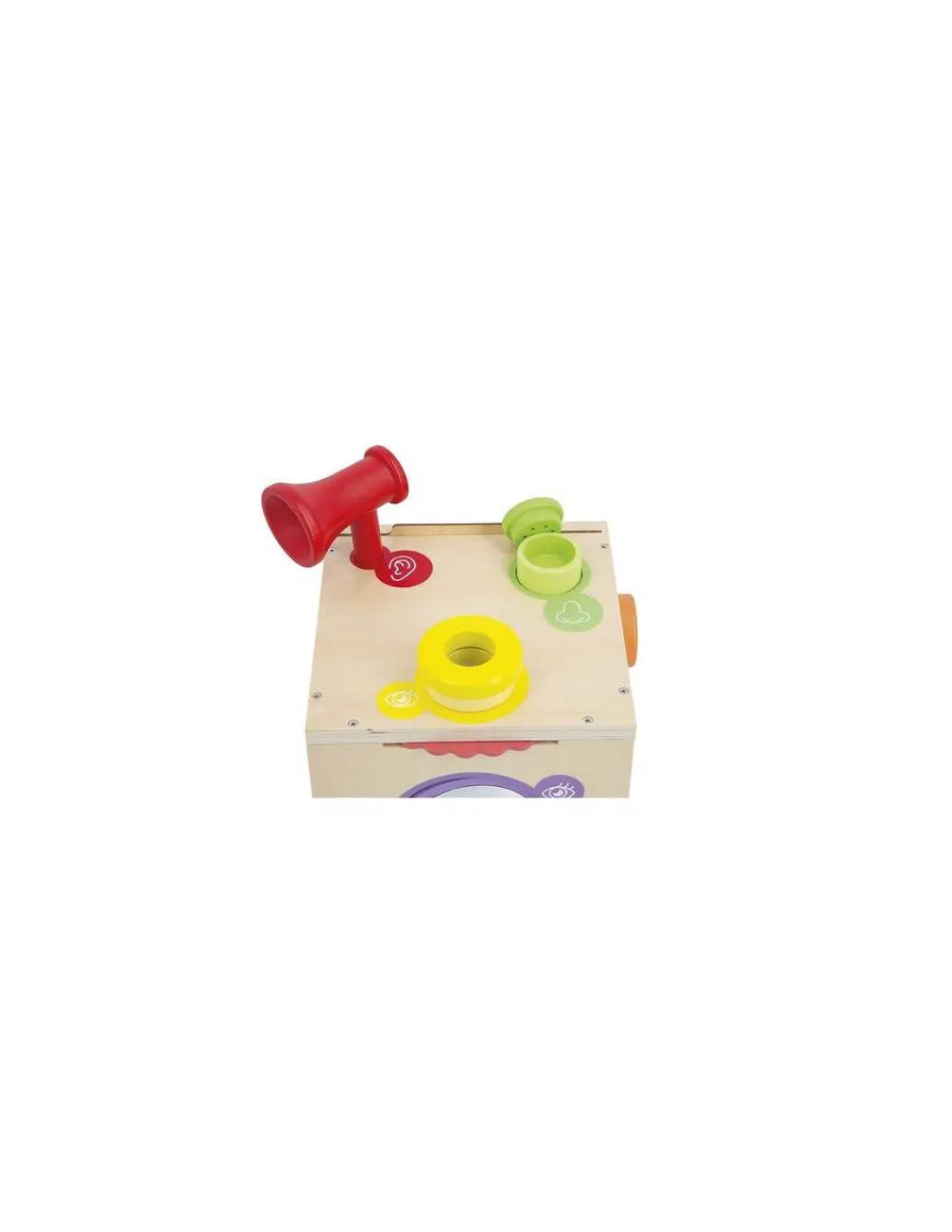 Cette boîte ludique propose une exploration complète des sens grâce à ses 12 accessoires soigneusement intégrés. L’ouïe est stimulée grâce à un mégaphone qui permet aux enfants d’expérimenter de légères déformations sonores pour une découverte amusante de la voix. Le toucher est mis à l’honneur avec deux entrées situées de chaque côté de la boîte, permettant aux enfants de glisser leurs mains à l’aveugle pour deviner les objets placés à l’intérieur.