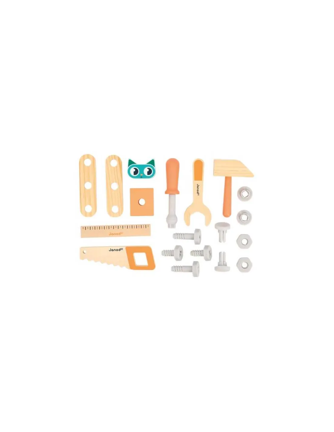 Le coffret comprend un marteau, un tournevis, une règle, une scie, une clé, 4 pièces en bois et 10 éléments en plastique.