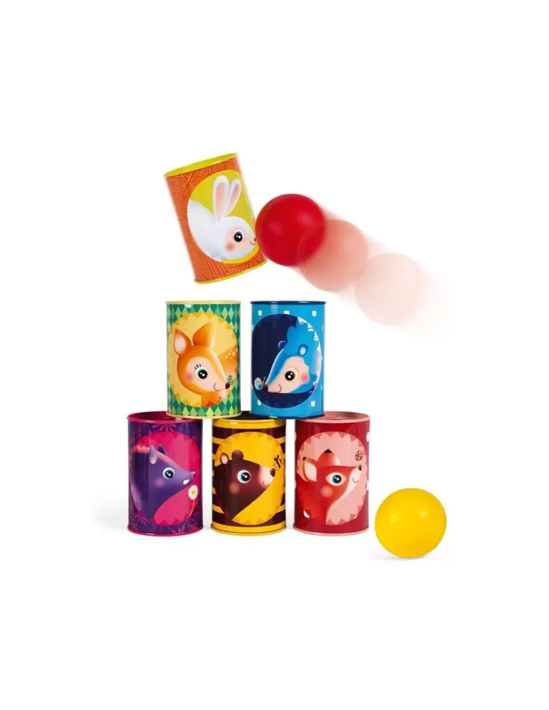 Découvrez le jeu de chamboul tout forêt de Janod, un jeu d’adresse incontournable lors des kermesses et des anniversaires. 6 boites de métal et 2 balles en mousse pour essayer de tout faire tomber pour les enfants à partir de 3 ans.