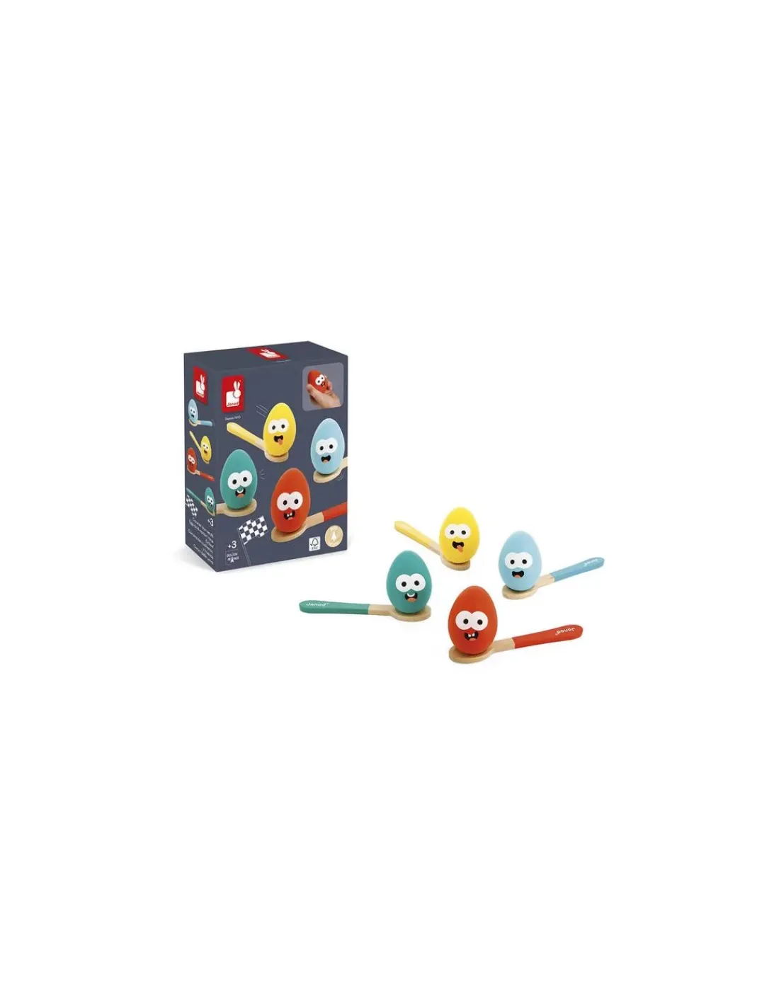 Le jeu comprend 4 œufs illustrés en bois et 4 cuillères en bois.
