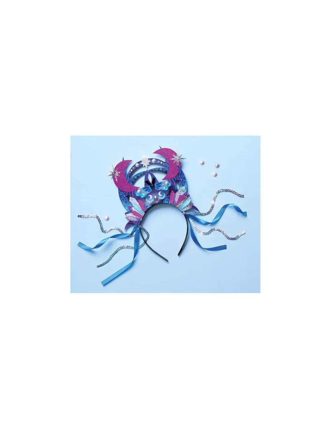 Le coffret comprend 2 planches de papiers prédécoupés à effets brillants, argenté et holographique, 2 planches de papiers imprimés et prédécoupés, 1 tube de colle, 1 ruban de satin, 4 demi-perles nacrées, 1 fil chenille, 1 ruban de sequins argentés et 1 serre-tête en satin.