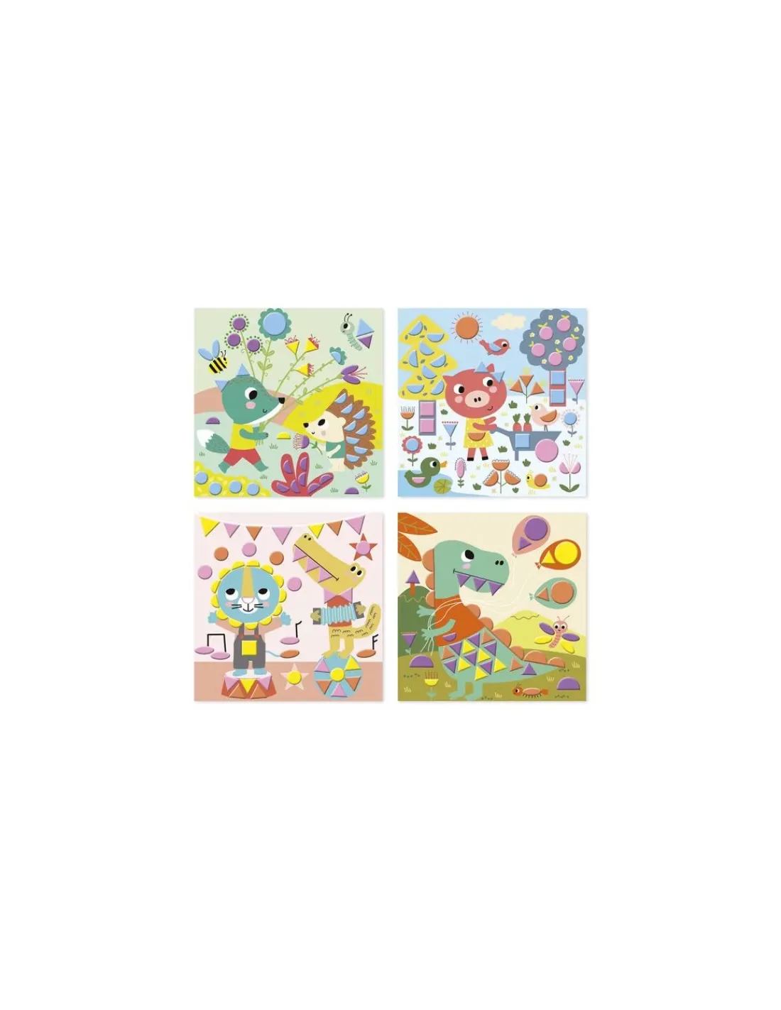 Un coffret contenant 4 tableaux à compléter avec 5 planches de gommettes géométriques en mousse autocollantes.