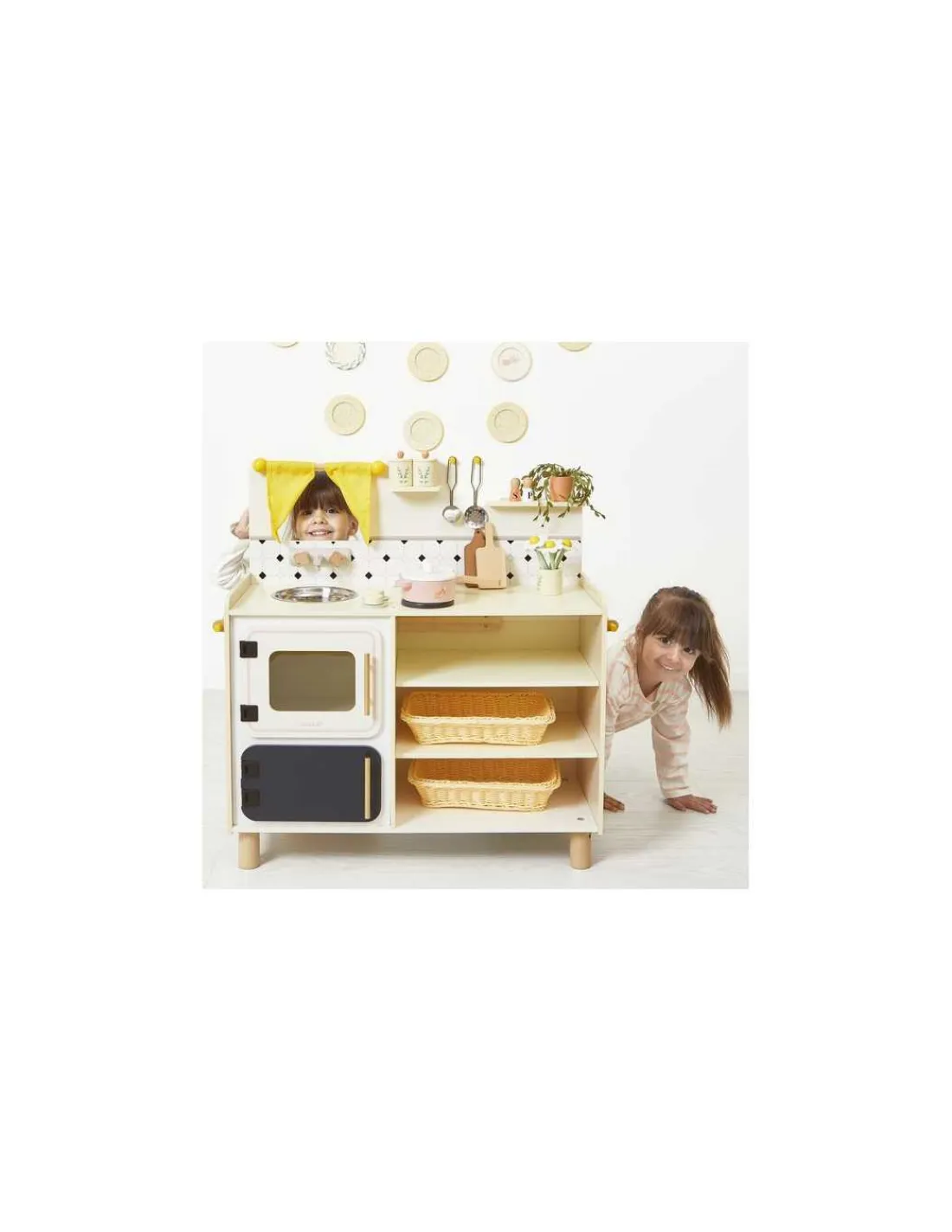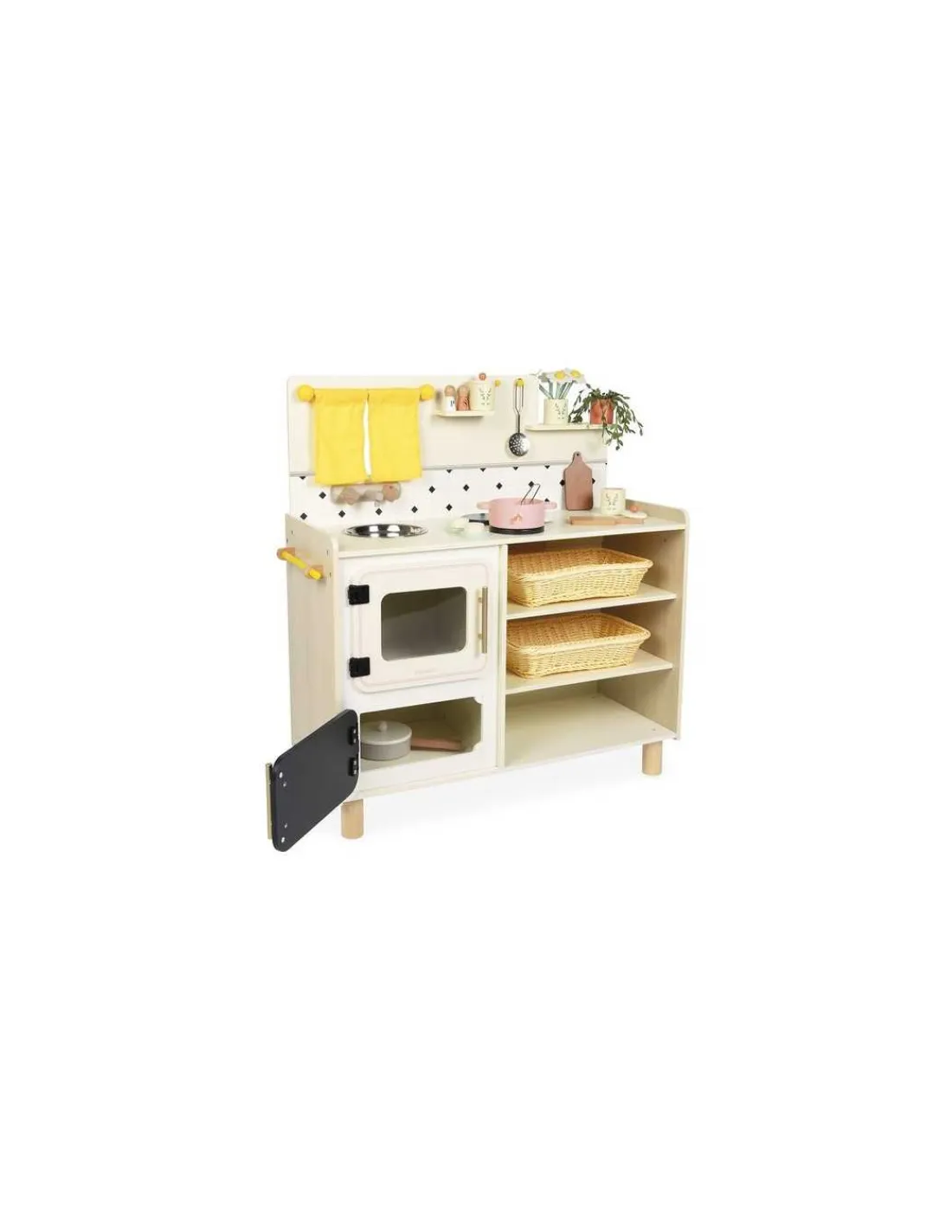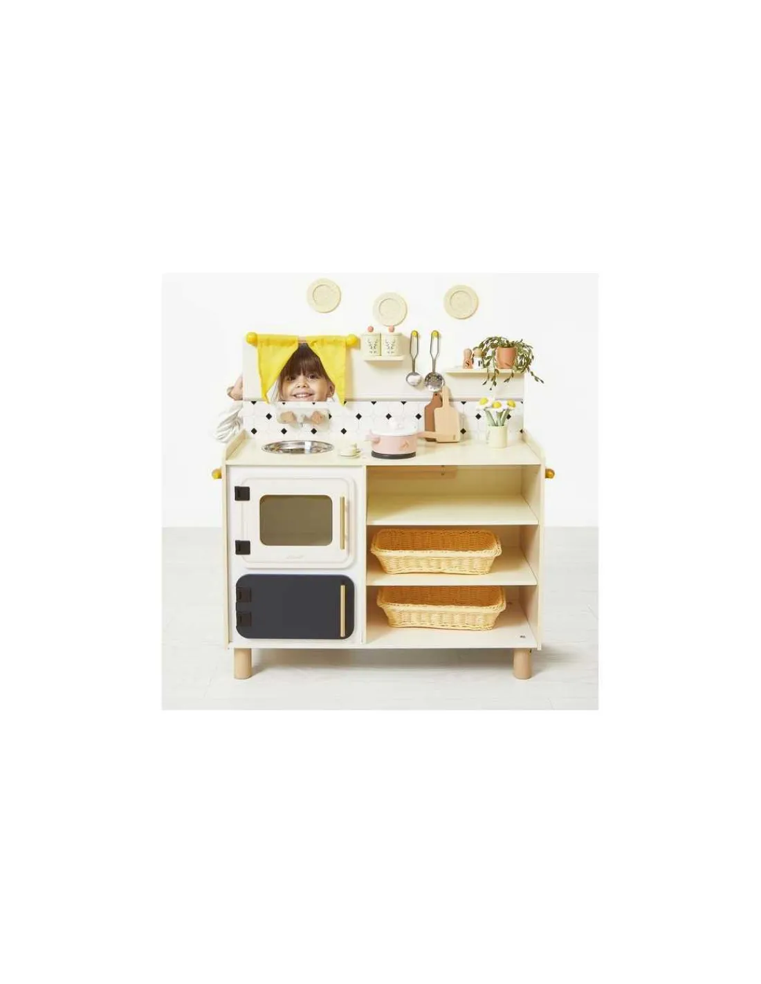 Cette cuisine au design vintage et aux teintes chaleureuses de jaune est équipée d’accessoires variés, de boutons rotatifs et de sons pour simuler de vrais bruits de cuisson. Complet et fonctionnel, ce jouet en bois propose une multitude d’accessoires : 2 casseroles (poêle et marmite), 2 ustensiles (louche et écumoire), 2 pots à épices, 1 salière, 1 poivrière, 2 grandes panières, 2 planches à découper, 1 vase, 1 bouquet de fleurs et 1 plante verte.