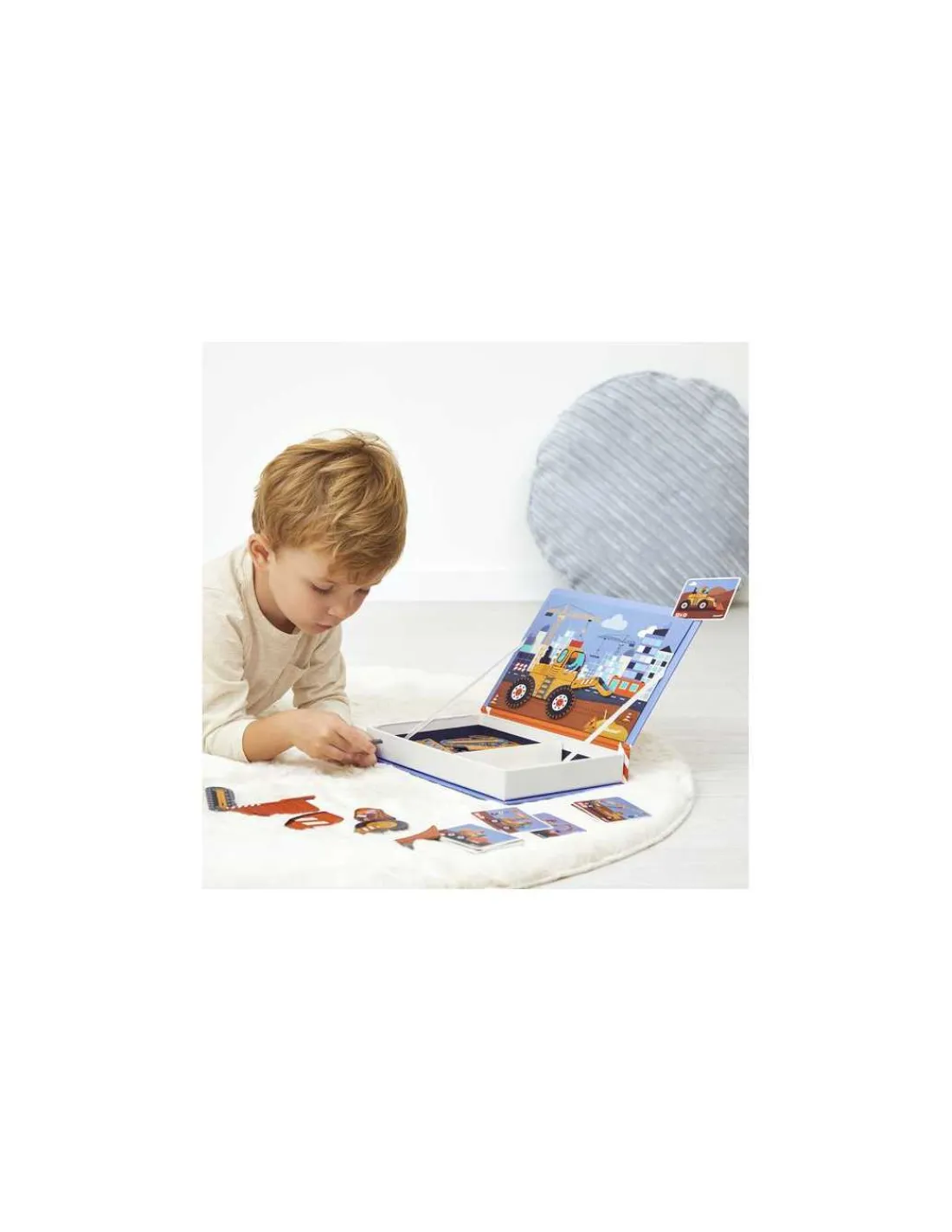 Présenté dans une boite livre à fermeture magnétique, ce jeu sur le thème du chantier s’emporte partout pour s’occuper à tout moment. Composé de 50 magnets et de 18 cartes, une fois le livre ouvert, le but du jeu est de recomposer des scènes de travaux avec les véhicules représentés sur la carte à l’aide des magnets. Votre enfant pourra reconstituer une tractopelle, une pelleteuse, un bulldozer, une grue…