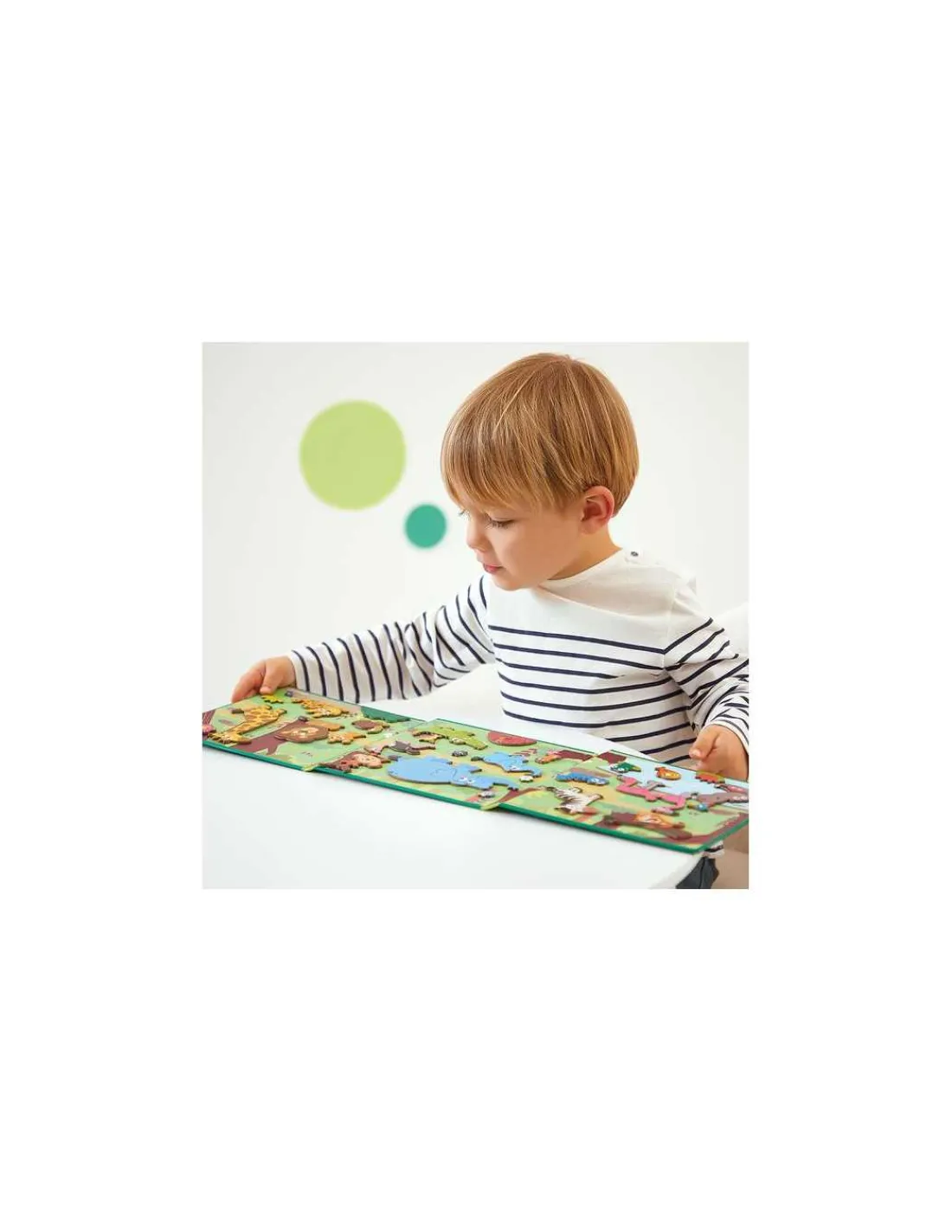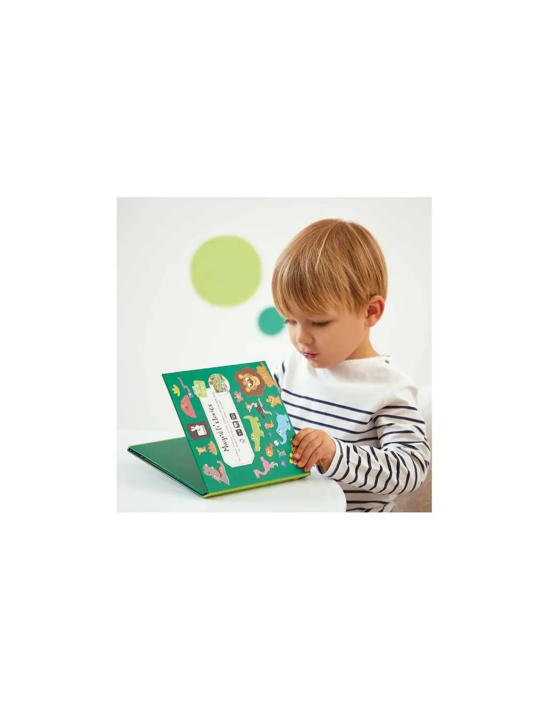 En ouvrant ce livre magnétique, votre enfant découvrira un joli décor, sur lequel il placera les pièces aimantées pour inventer de belles histoires avec des animaux de la savane.