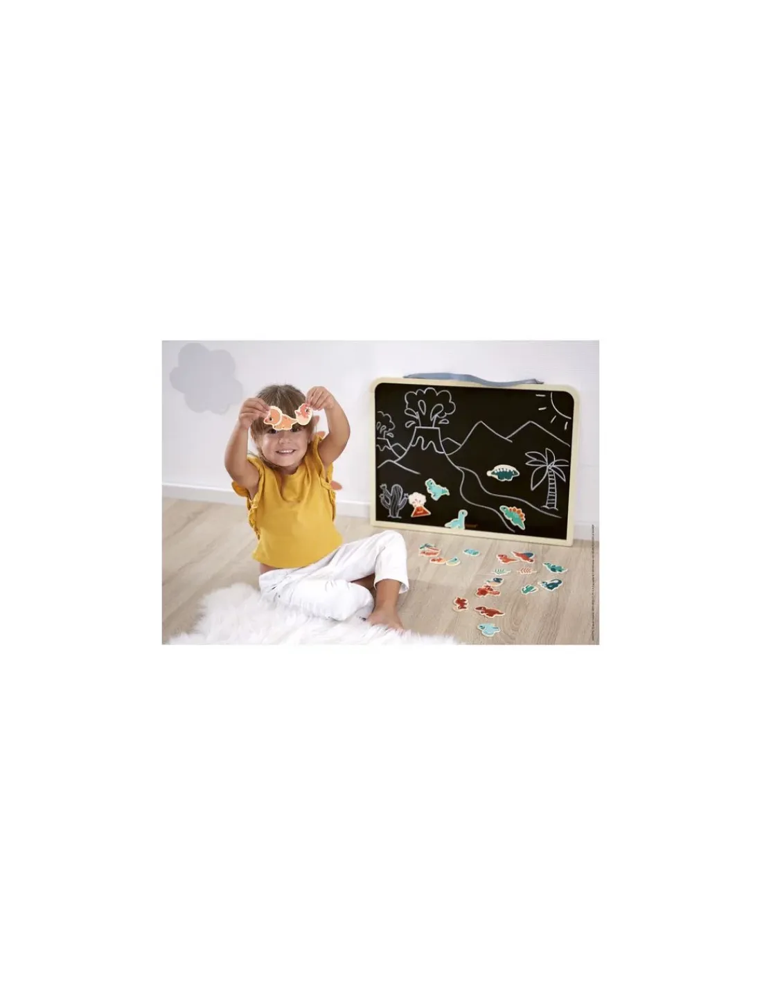 Votre enfant s’amusera à placer ces jouets en bois sur un tableau magnétique ou sur le frigo pour inventer des histoires sur le thème des dinosaures. En ouvrant ce joli coffret, il trouvera des dinosaures, un volcan, des oeufs de dinosaures, un arbre…