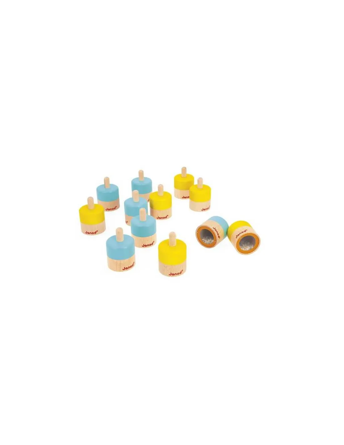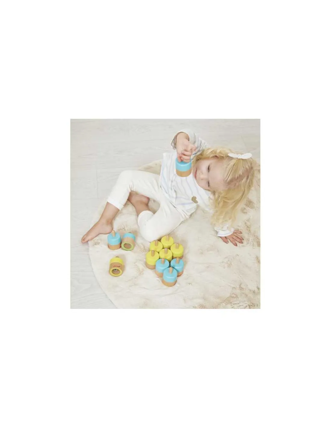 Ce jeu de mémoire invite les enfants à recomposer 6 paires en identifiant les sons qu’elles reproduisent. Chaque paire est composée d’une pièce jaune et d’une pièce bleue, représentant l’un des 6 sons distincts : une clochette, du sable, une bille en bois, des petits bouts de carton, des billes en plastique ou encore des petites pièces de bois.