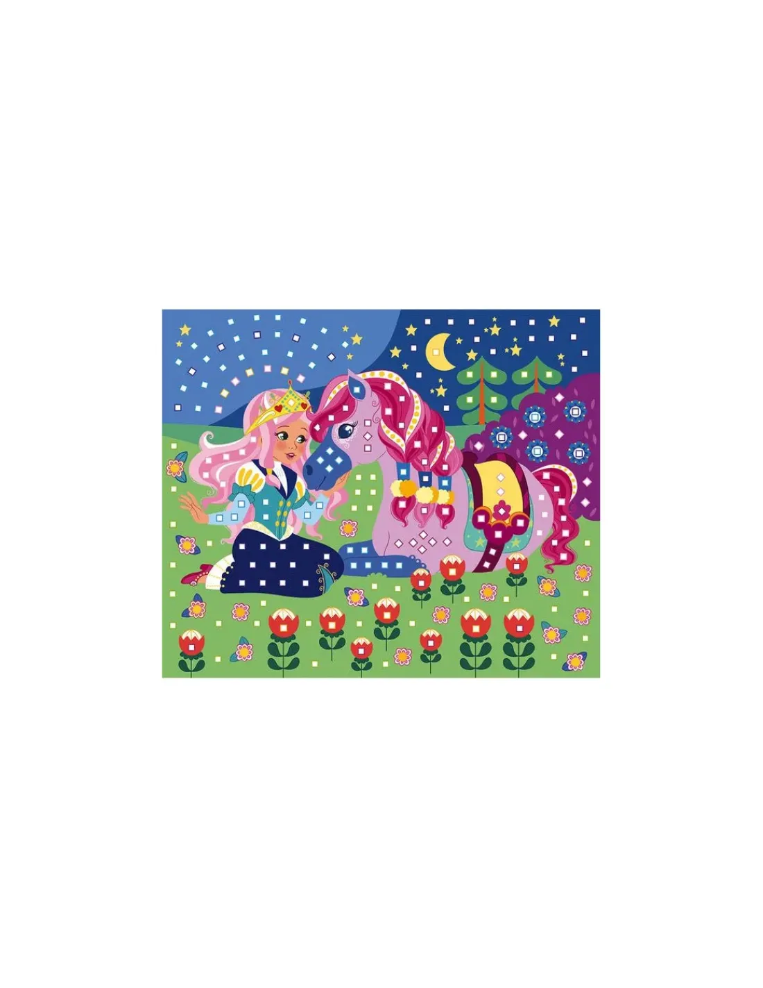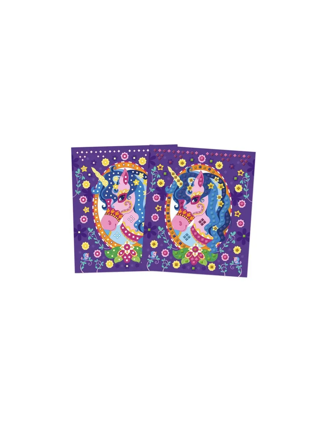 Un coffret contenant 3 tableaux à décorer, 600 mosaïques mousse autocollantes pailletées ou mates et 1 livret avec modèles et instructions.
