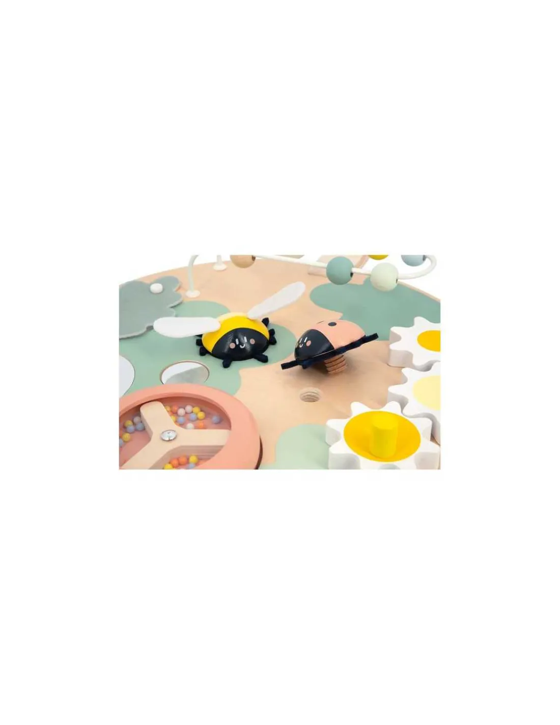 Ce jouet aux couleurs scandinaves propose 7 activités différentes pour développer la concentration et la motricité fine de bébé : 3 engrenages en forme de fleur, 1 abeille qui fait « cric-cric », 1 coccinelle à visser, 1 boulier, 3 miroirs dont un déformant, 1 coquille rotative avec des perles colorées qui bougent à l’intérieur et 1 feuille en feutrine à soulever ou faire tourner pour découvrir le miroir caché.