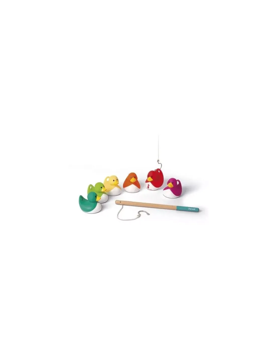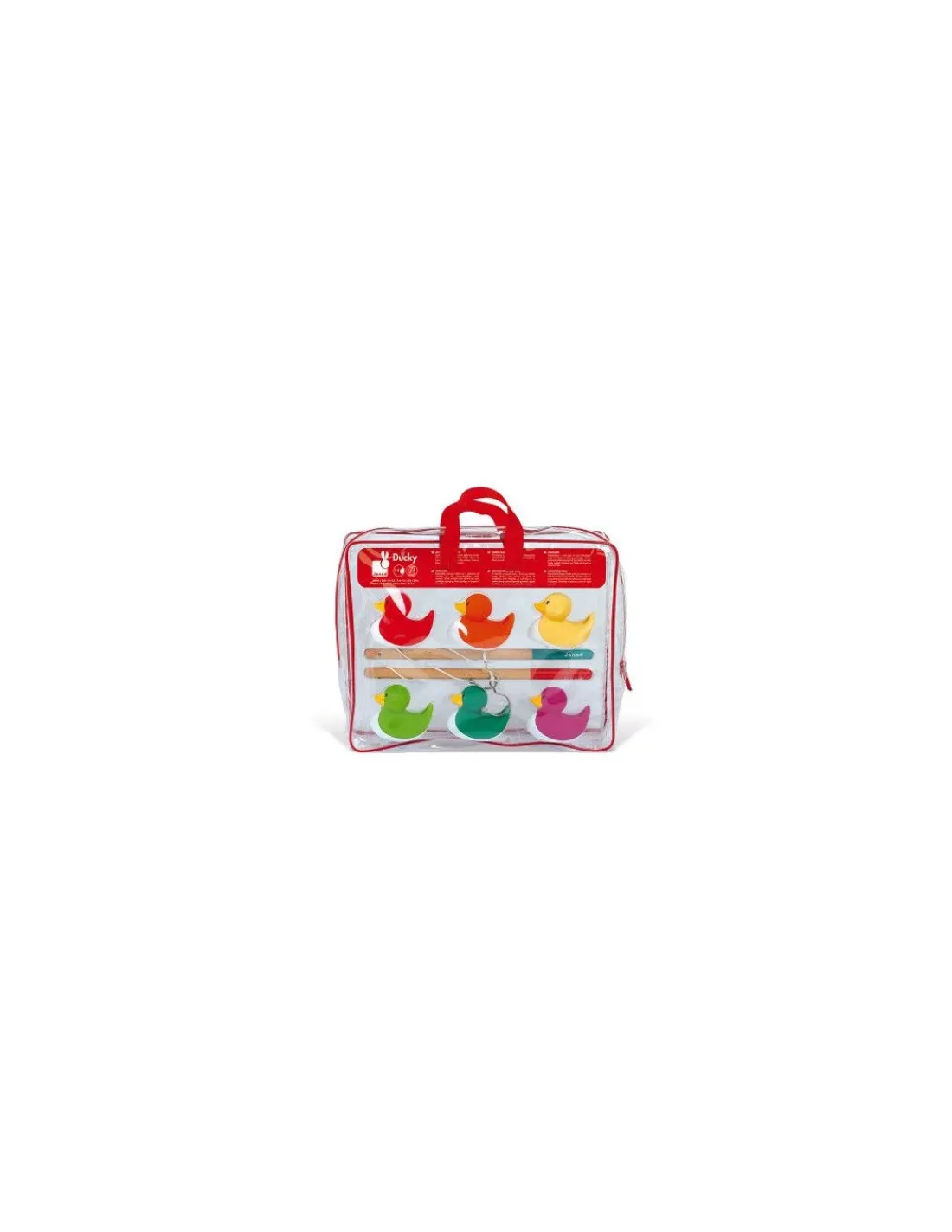 Découvrez le jeu de pêche à la ligne Ducky de Janod, une jolie pêche aux canards composé de 6 canards en caoutchouc colorés et de 2 cannes en bois pour une activité originale et amusante pour les enfants.
