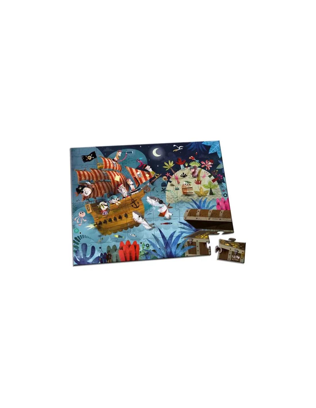 Découvrez le puzzle la chasse au trésor de Janod, un magnifique puzzle de 36 pièces en carton pour les enfants à partir de 4 ans. Un puzzle fabriqué en France avec une superbe illustration sur le thème des pirates.