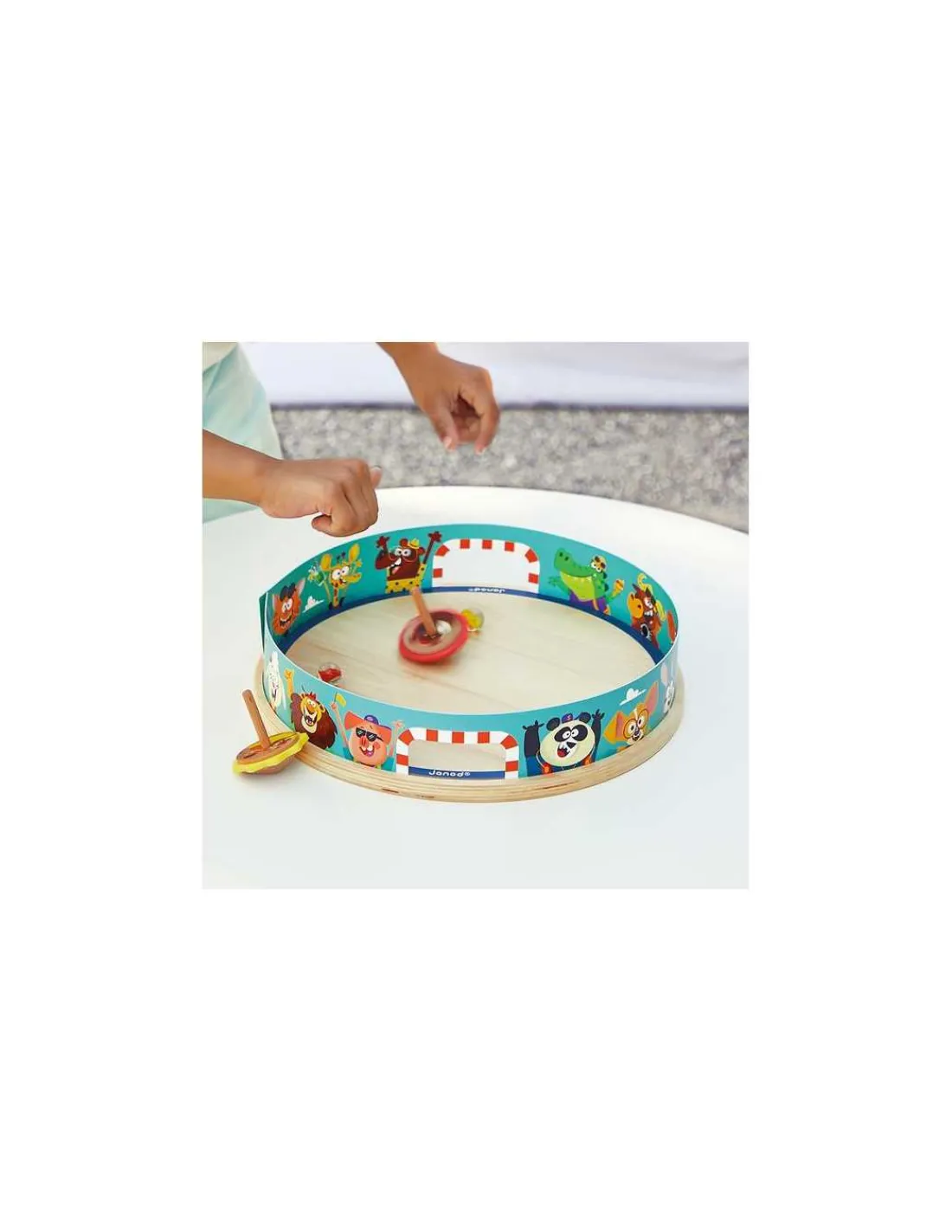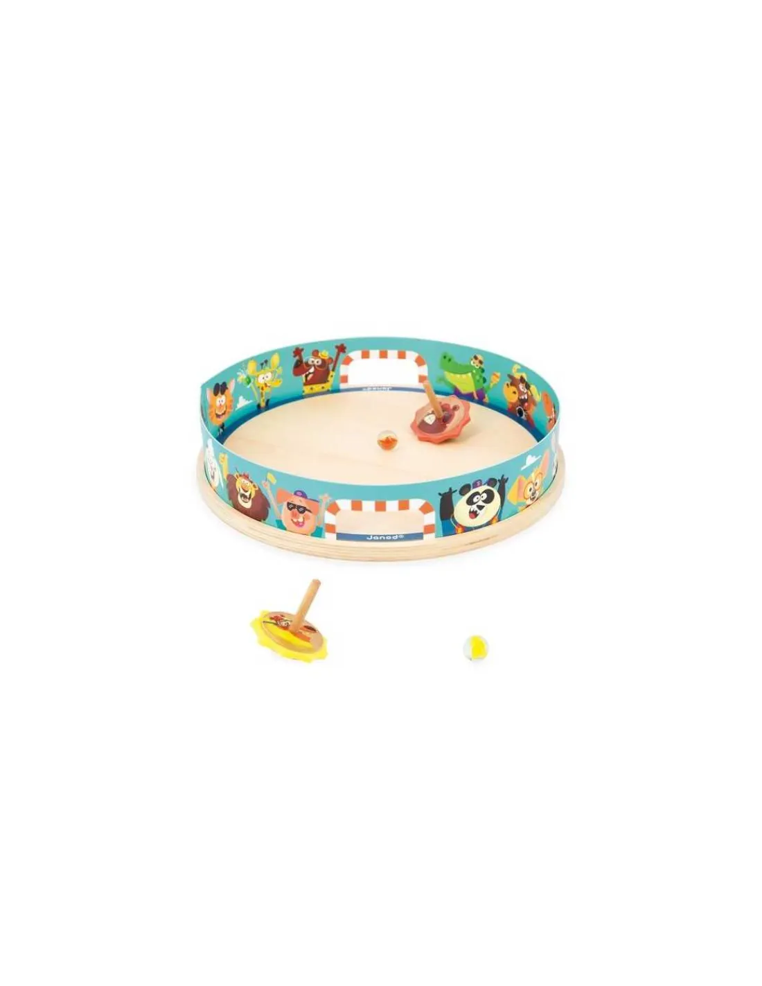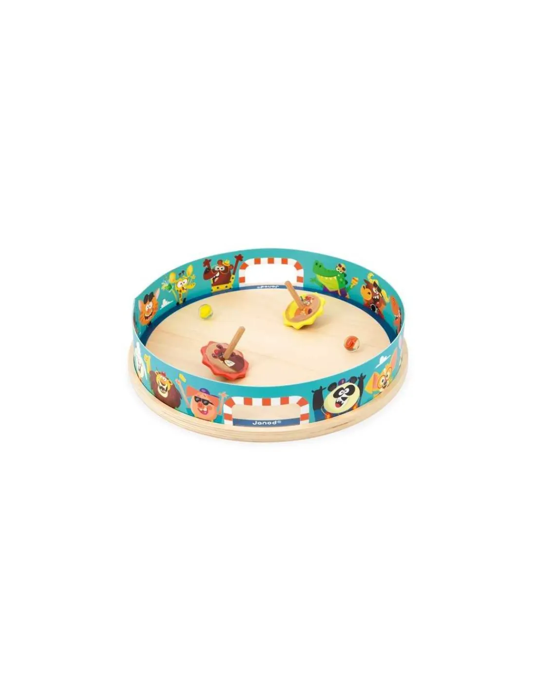 Un jeu en bois composé d’une arène, de 2 toupies et de 2 billes de verre. Les toupies en bois possèdent également une partie en silicone pour mieux rebondir. Un jeu amusant qui permet aux enfants de développer leur dextérité et leur coordination main-oeil.