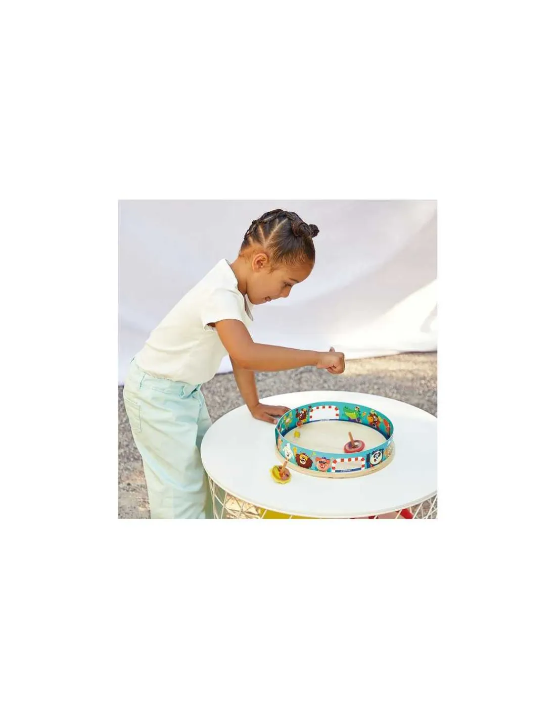 Dans l’arène, la foule est en délire! Votre enfant s’amusera à relever des défis. En faisant tourner les toupies, il tentera de faire sortir les billes de l’arène.
