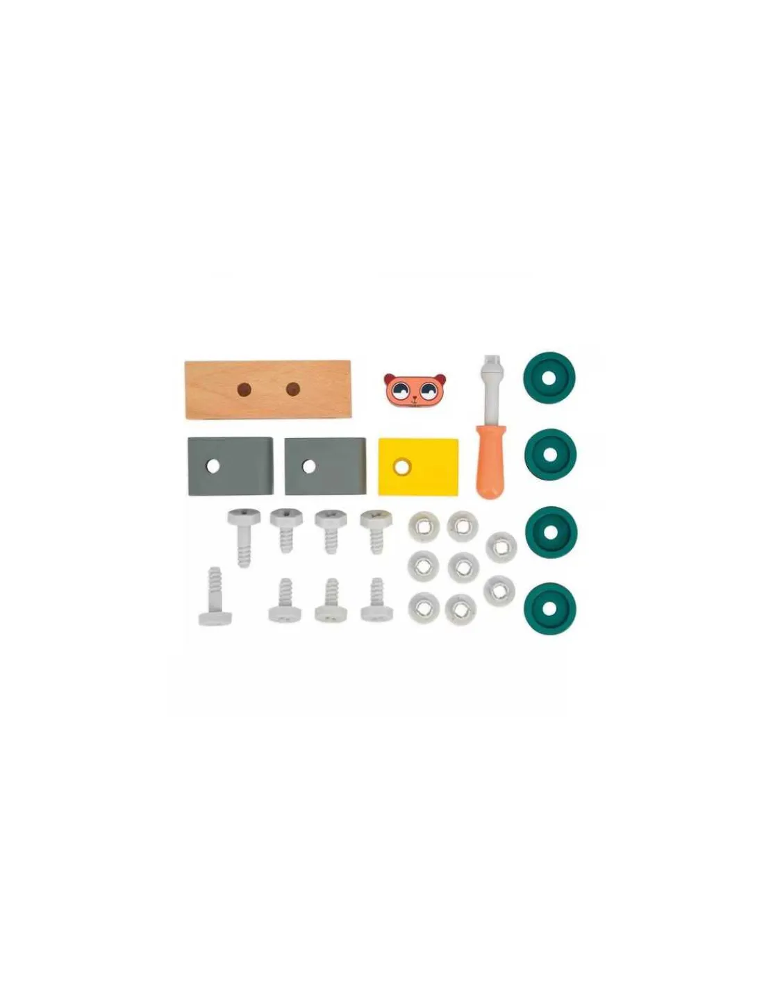Un premier jouet à bricoler accompagné de pièces en bois, d’éléments en plastique et d’un tournevis. Chaque pièce est spécialement adaptée aux petites mains. Les vis, écrous, inserts et clous en plastique sont spécialement conçus pour la sécurité et la facilité d’utilisation des enfants.