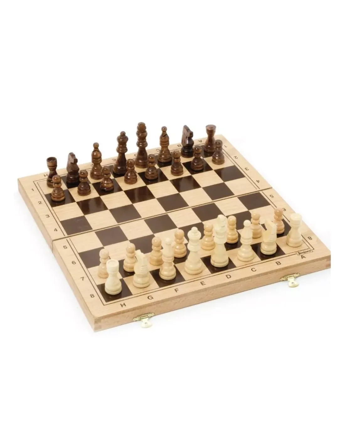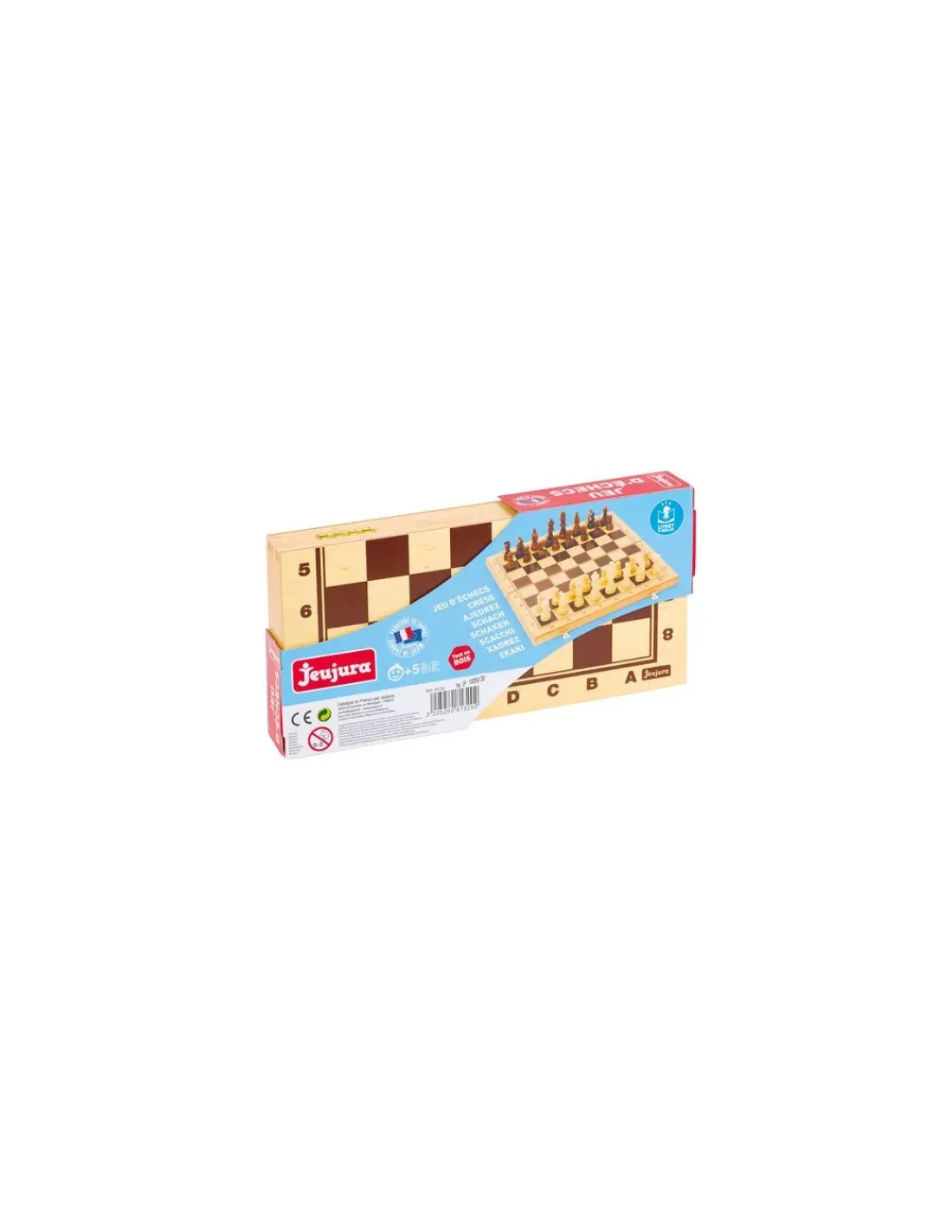 Le jeu comprend le plateau de jeu sérigraphié et les pièces d’échecs en bois.