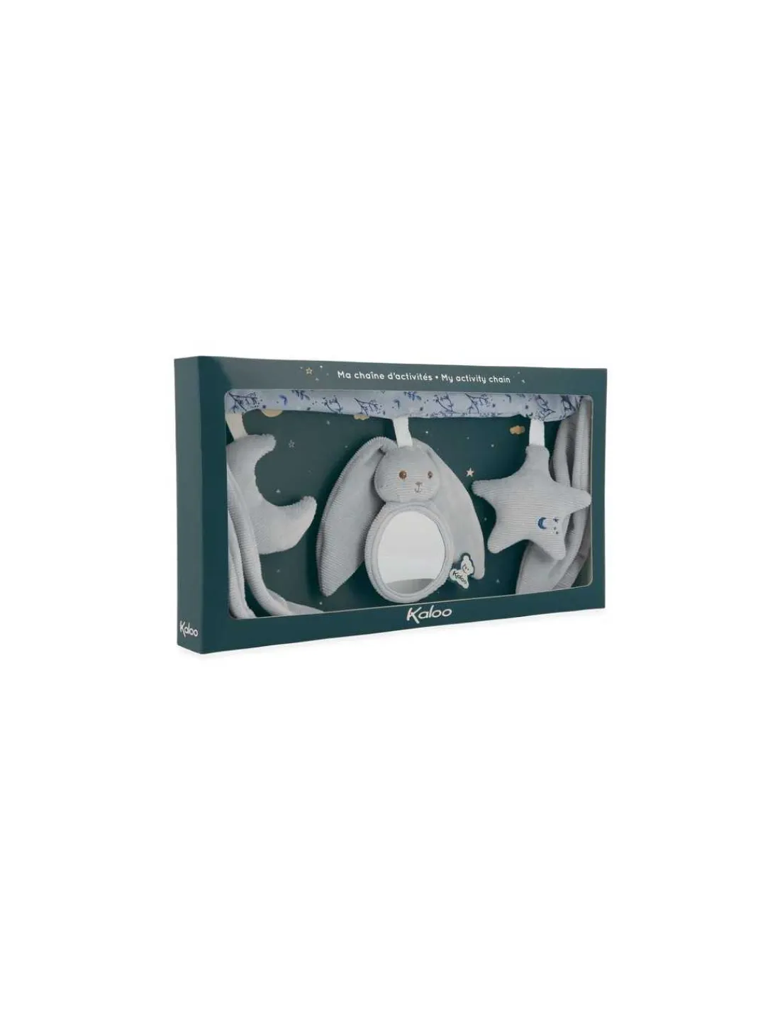 Découvrez Ma chaîne d’activités bleu de Kaloo, un jouet en tissu à suspendre pour éveiller les sens de bébé dès sa naissance.