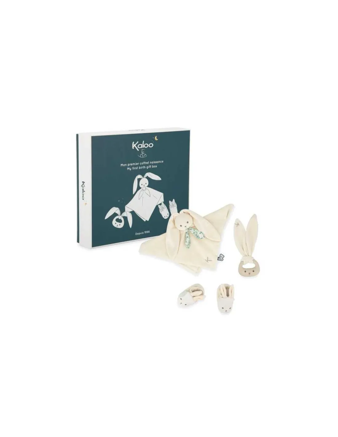 Découvrez Mon premier coffret naissance crême de Kaloo, un coffret de naissance à offrir avec 3 essentiels: le doudou, l’anneau de dentition et les chaussons, présenté dans une boite cadeau parfaite pour offrir à un bébé.