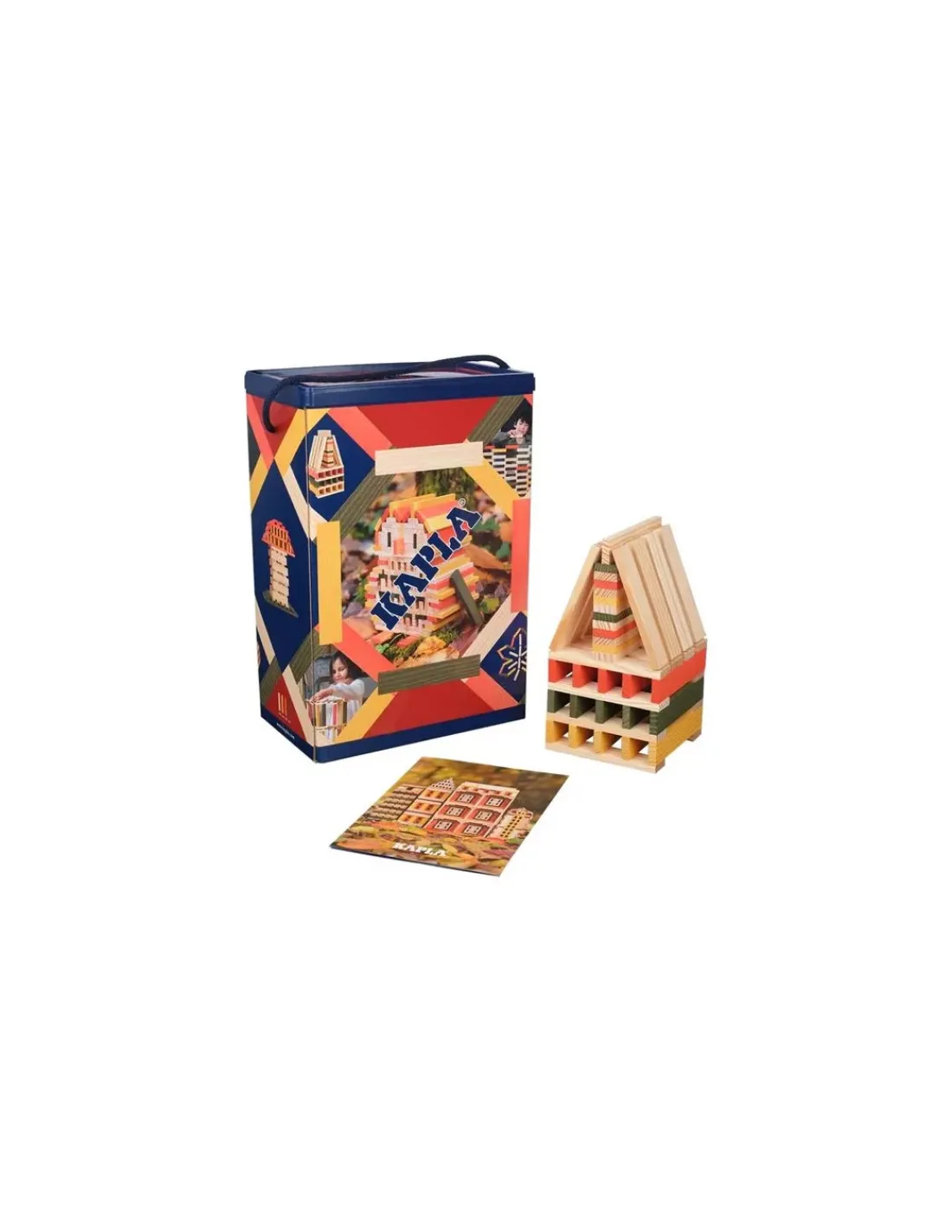 Un coffret qui contient 140 planchettes couleur bois, 20 planchettes orange, 20 planchettes jaunes et 20 planchettes vertes ainsi qu’un triptyque format A5 présentant 3 constructions inédites étape par étape. Des constructions guidées qui en inspireront bien d’autres!