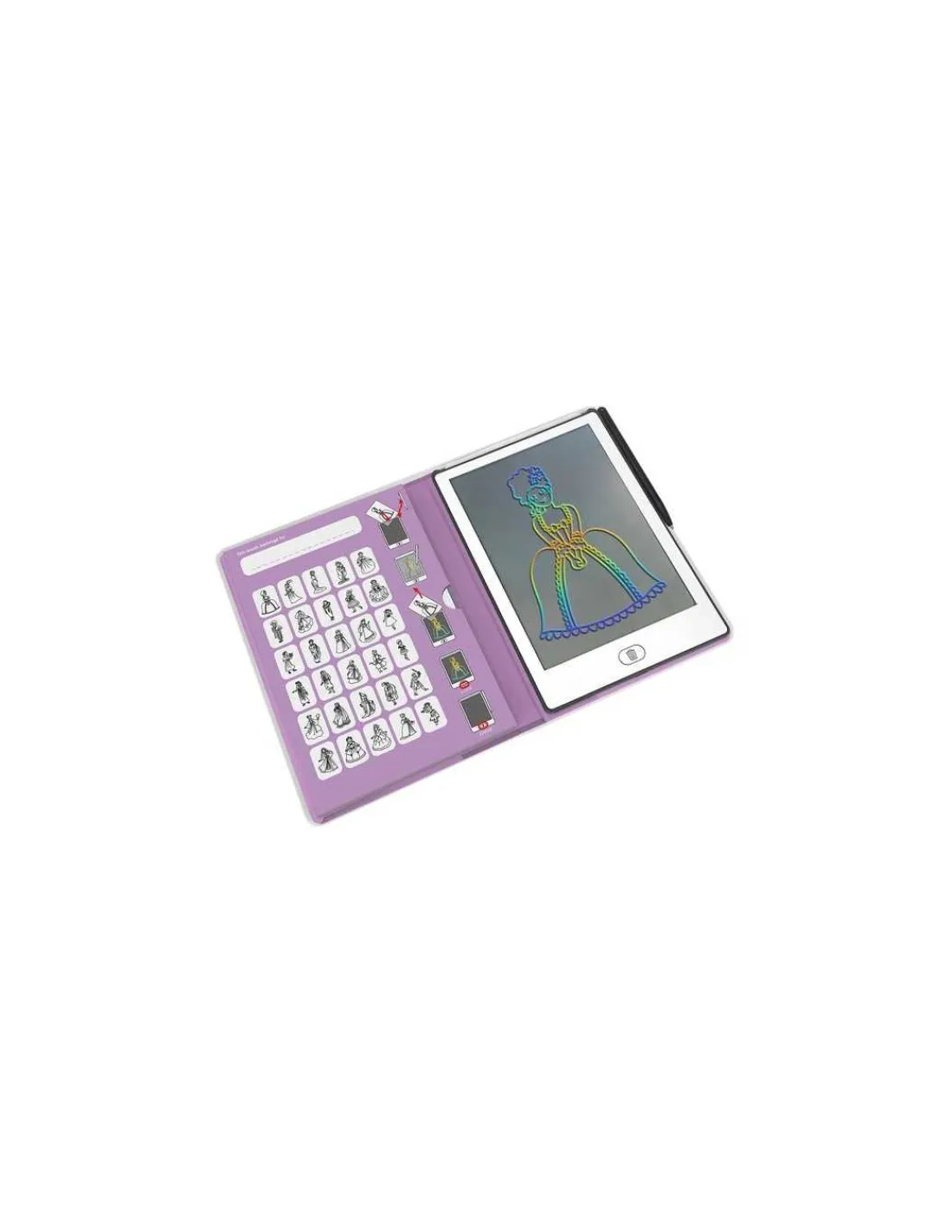 Le coffret comprend une tablette avec 30 dessins à décalquer avec un écran LCD de 8,2″ (Liquid Crystal Display), un bouton verrou pour sauver le dessin, un bouton pour effacer et un stylo.