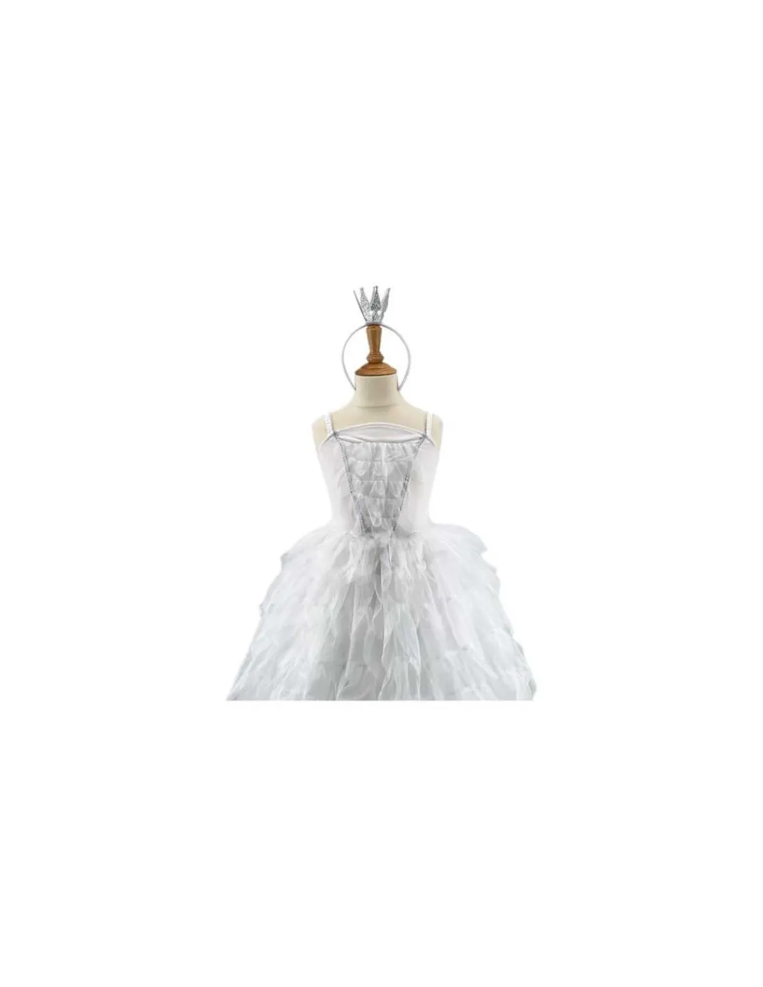 Les délicates applications de tulles, avec leur effet plumes, ajoutent une touche aérienne et féerique à la robe. Un diadème en tissu, orné d’une couronne argent, complète ce costume enchanteur. Il ajoute une touche royale et brillante, captant la lumière à chaque mouvement, et conférant à votre enfant l’apparence d’une véritable princesse du ballet.