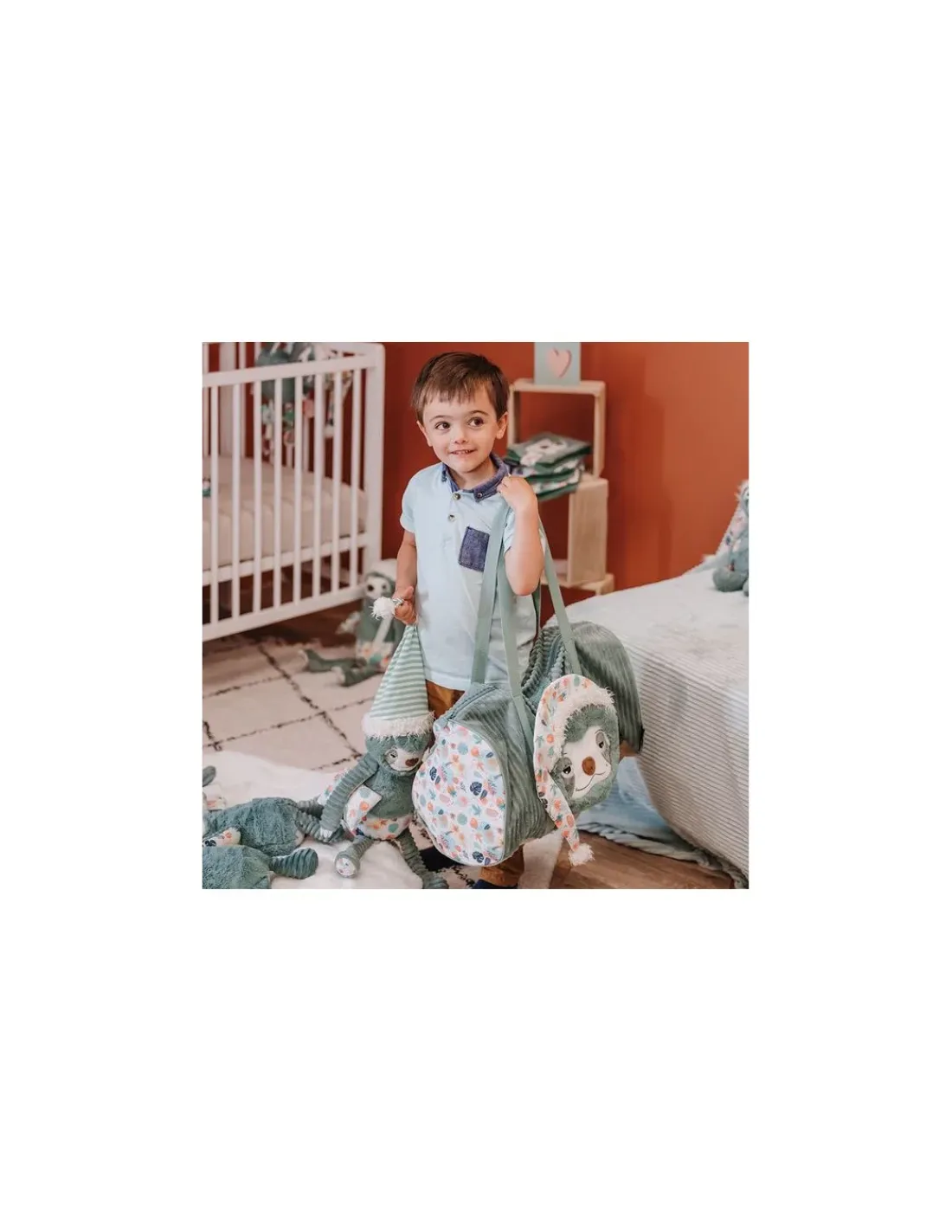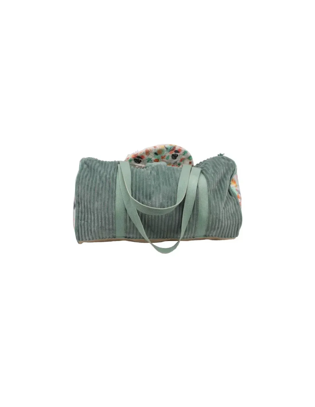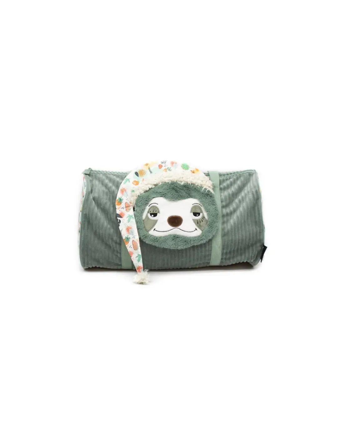 Découvrez le sac de voyage Chillos le paresseux de Déglingos, un grand sac bowling en velours côtelé et tissu imprimé pour emporter toutes ses affaires pour partir en week-end ou en vacances.