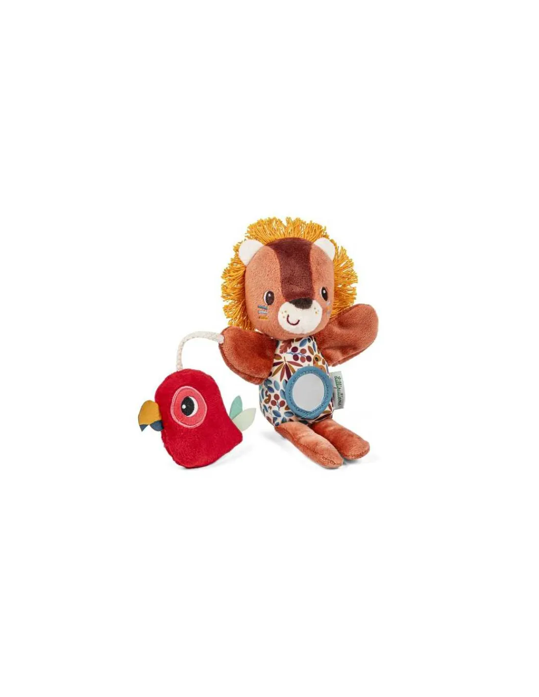 Jack propose 3 activités pour divertir et stimuler les sens de votre bébé : un hochet situé au niveau de la tête, un miroir sur son ventre et son compagnon Gilles le perroquet qui crépite grâce à du papier bruissant.