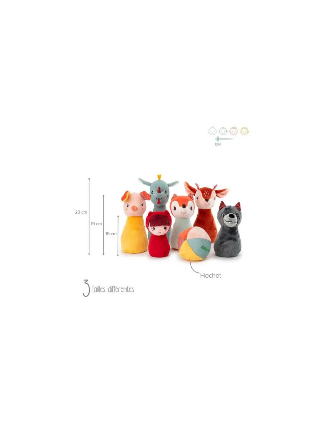 Ce jeu joyeux et coloré, dont les personnages de la forêt sont les quilles, est une variante stimulante au jeu de quilles classique. L’ensemble comporte six personnages ainsi qu’une petite balle qui recèle une petite clochette pour plus de plaisir et de découverte.