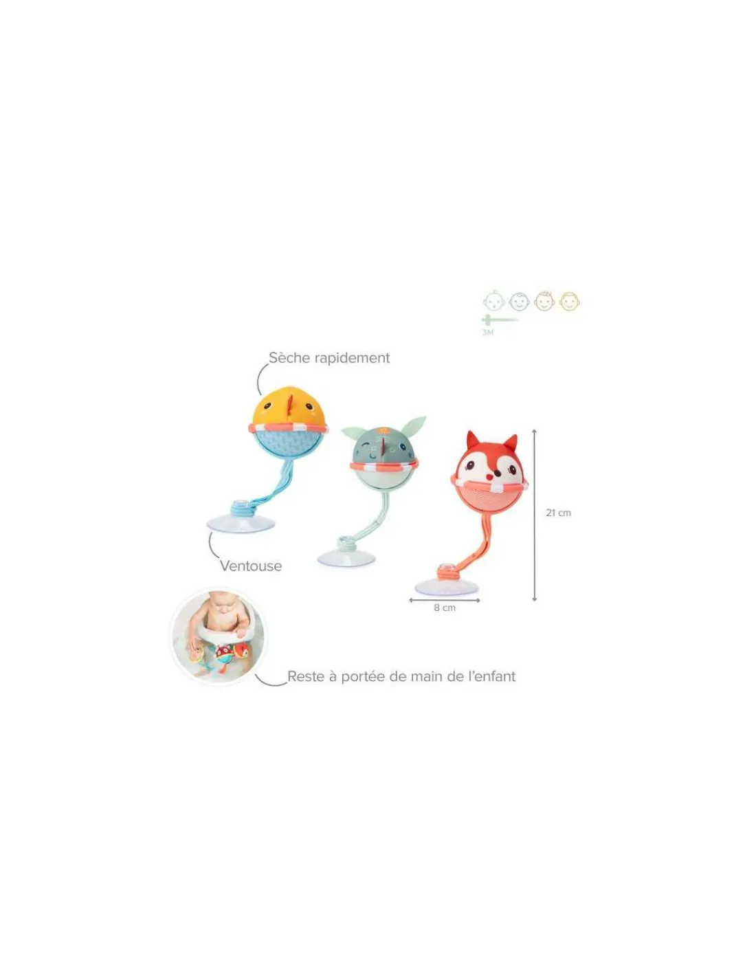 Joe, Alice et Gaspard flottent dans leur bouées colorées dans le bain aux cotés des plus petits. Les 3 balles de bain en néoprène se fixent avec des ventouses sur la paroi du bain et dansent sur l’eau, sous les yeux de bébé.
