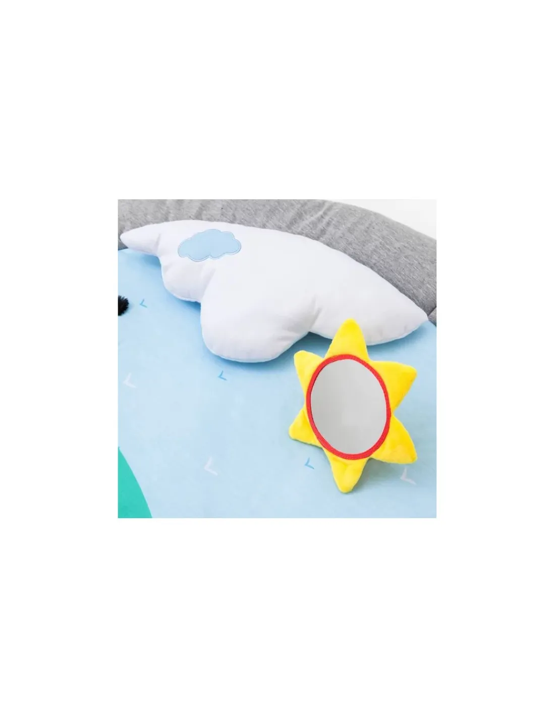 Vous apprécierez les jeux de matières à toucher, ses jolies couleurs contrastées, ses animaux cachés, son miroir soleil… Bébé passera des heures à s’amuser sur ce tapis tout en développant sa motricité et sa motricité fine. Il est moelleux et tout doux et son coussin amovible en forme de nuage aide bébé à maintenir sa tête droite et à renforcer les muscles du haut de son corps lorsqu’il est à plat ventre.