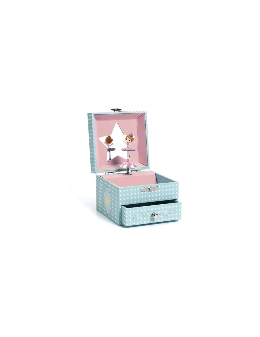 Une petite boite à musique Djeco avec tiroir où une ballerine se mettra à danser lorsque vous actionnerez la musique. Le tiroir et le compartiment lui permettront de ranger bijoux, trésors et secrets … et de s’admirer dans le petit miroir silhouetté en forme d’étoile devant lequel danse la danseuse.