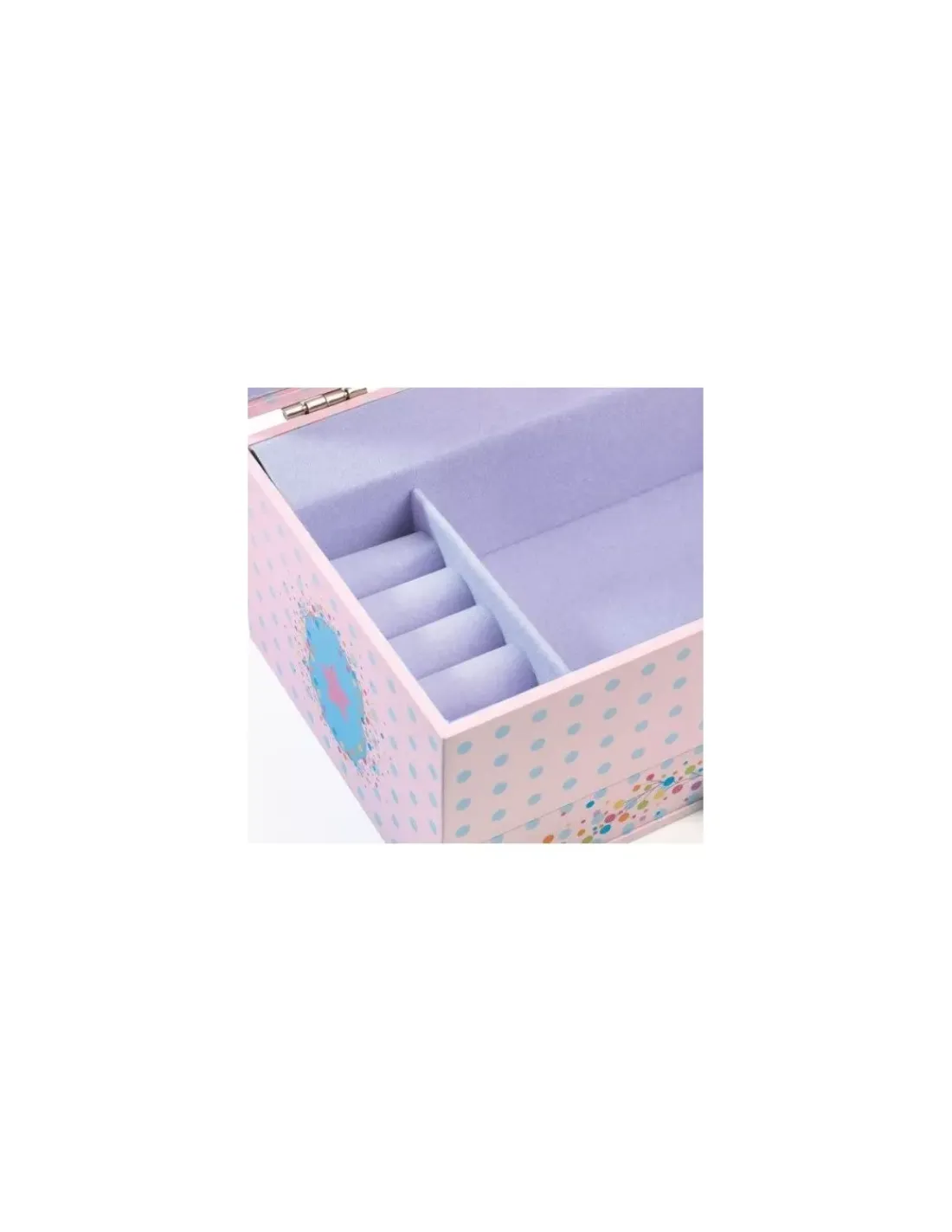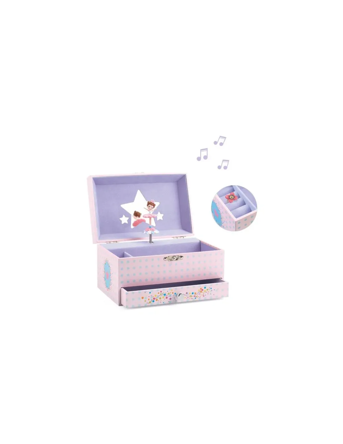 Une jolie boite à musique Djeco avec un grand compartiment pour ranger tout ses trésors, un compartiment pour ranger ses bagues et un tiroir pour ses secrets. Votre enfant s’admirera devant le miroir silhouetté en forme d’étoile et regardera danser la ballerine qui s’animera en musique à l’ouverture de la boite.