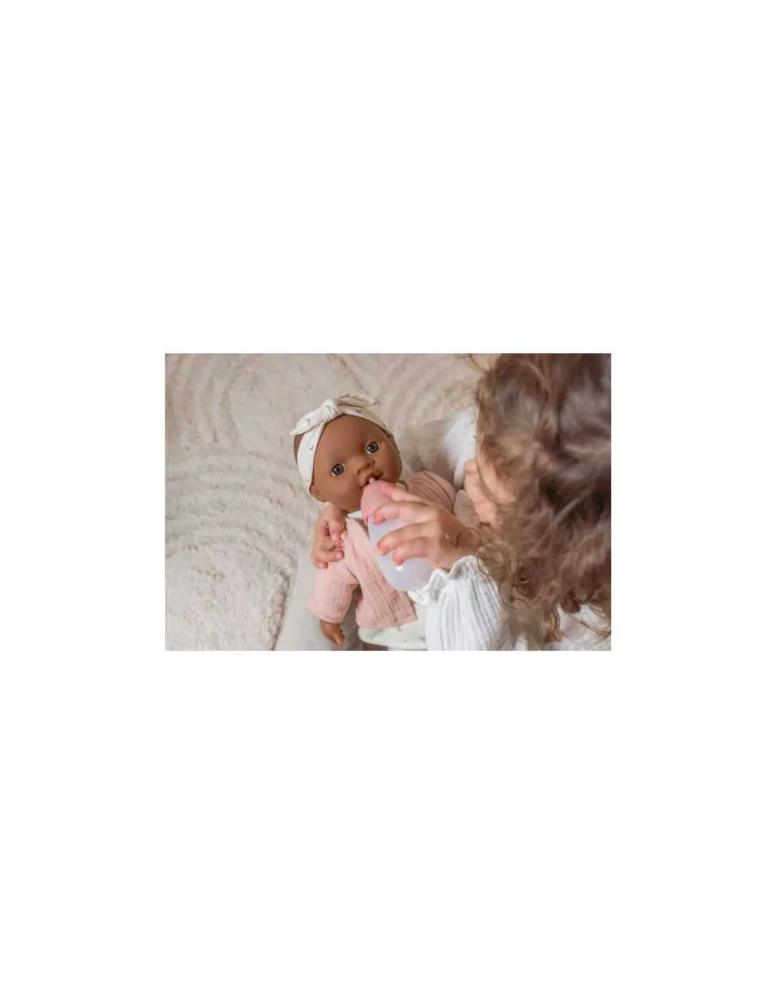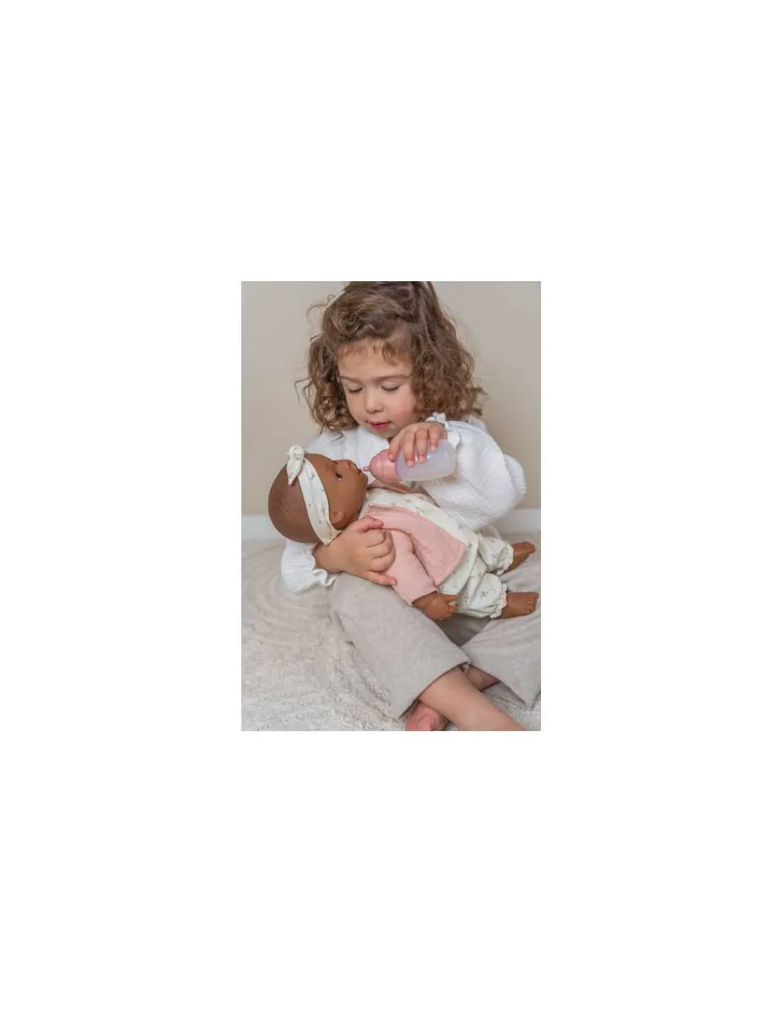 Votre enfant pourra prendre soin d’elle comme un véritable parent : lui donner son biberon de lait lorsqu’elle a faim, la calmer avec sa tétine ou encore l’aider à s’endormir. Noa est habillée avec élégance dans une tenue aux motifs White Meadows, composée d’une robe, d’un pantalon, d’une veste rose tendre et d’un joli bandeau. Ses vêtements peuvent être changés, stimulant ainsi la motricité fine et l’autonomie des tout-petits.