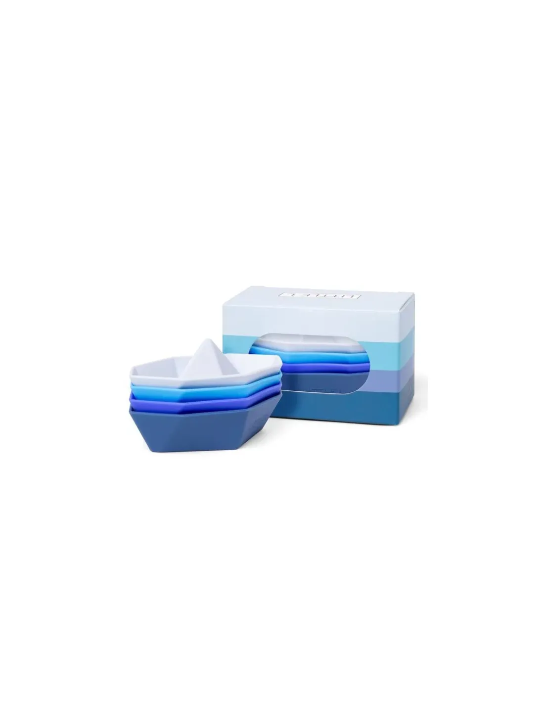 Découvrez les bateaux de bain de LittLe L, 4 adorables bateaux en silicone dans différents teintes de bleus pour amuser votre enfant lors du bain.