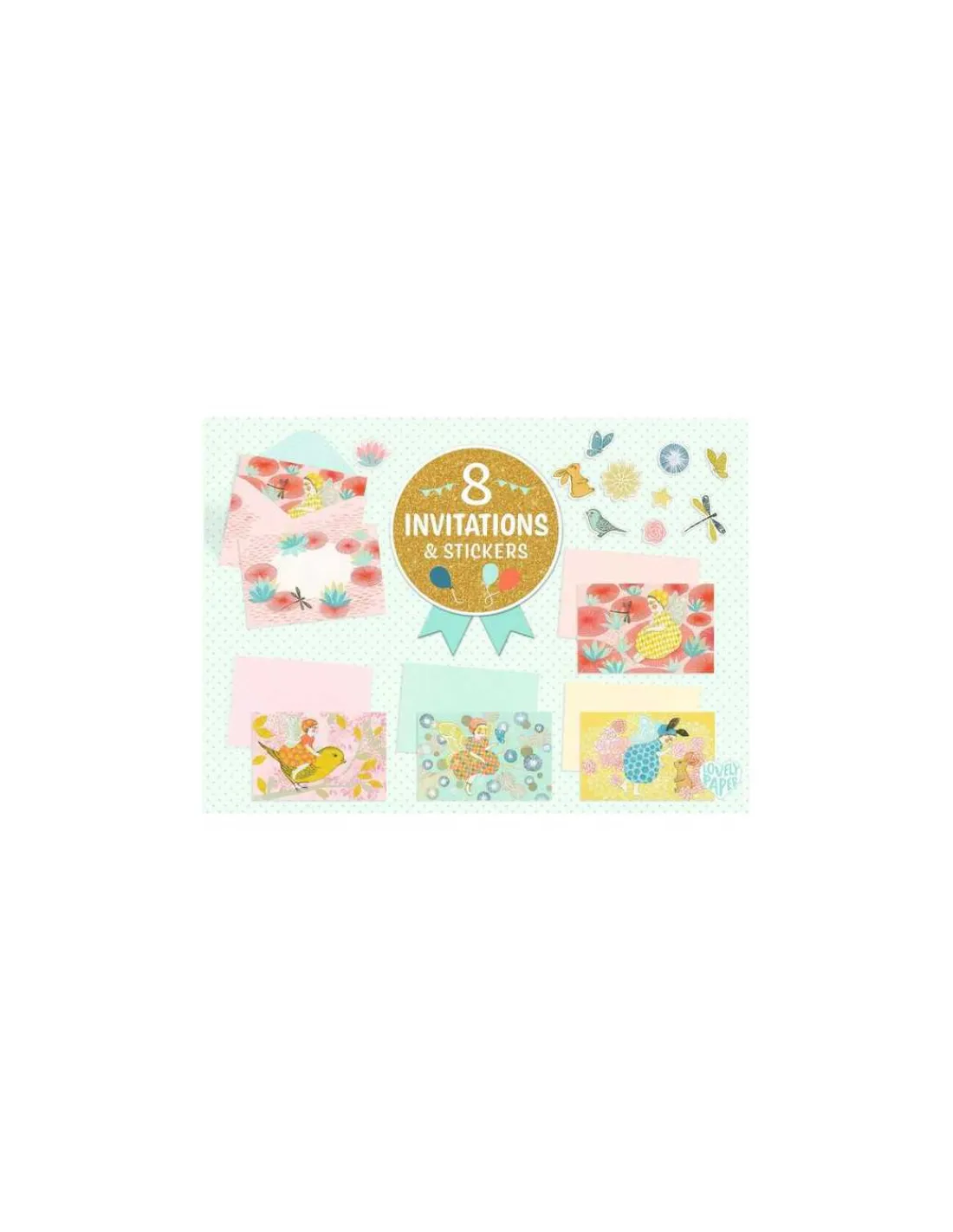 Ce coffret contient 8 cartes d’invitation (4 x 2), 8 enveloppes (4 x 2) et 2 planches de stickers sur le thème « Fée ».