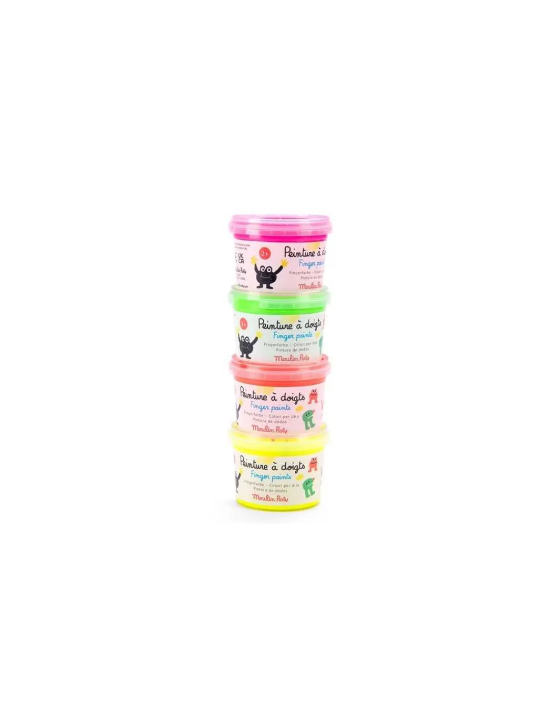 Découvrez les 4 pots de peinture à doigts fluo de la collection Les Schmouks de Moulin Roty, 4 pots de peinture à doigts fluo pour laisser libre court à la créativité des petits à partir de 2 ans!