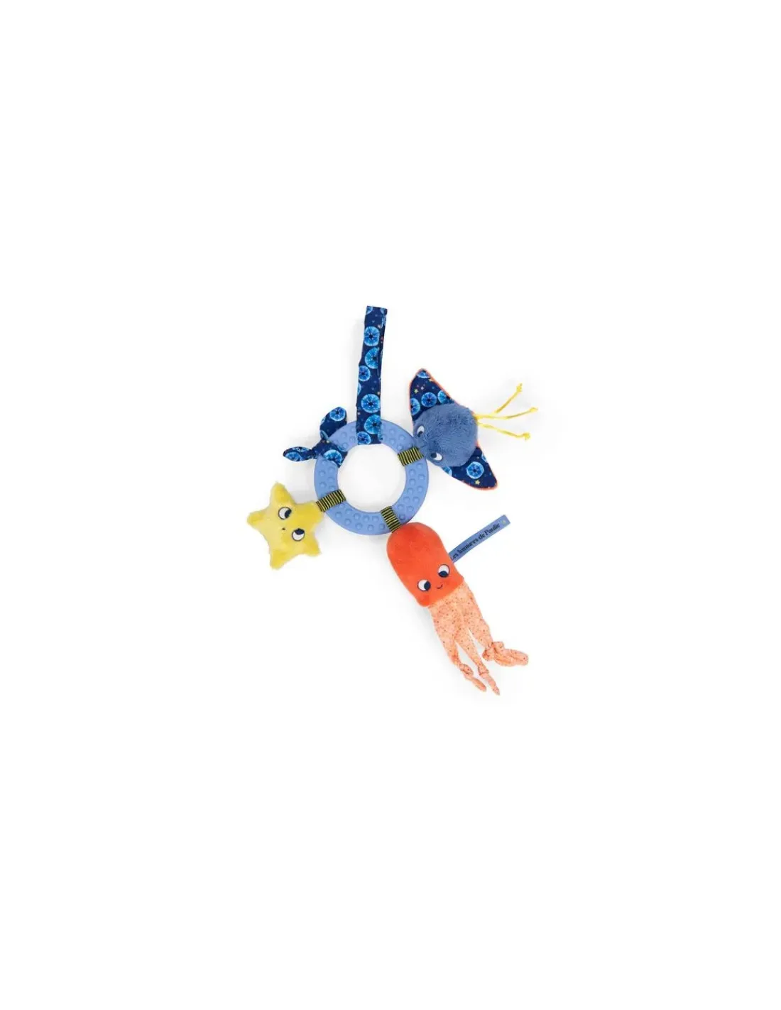 Paulie le poulpe et ses amis la raie et l’étoile de mer suivront votre enfant dans chacun de ses déplacements. Pratique, ce jouet d’éveil s’attache facilement au cosy, à la poussette, au parc ou à une arche d’activités grâce au velcro. Un anneau d’activités à manipuler ou à suspendre composé de trois petits personnages marins aux matières et sons différents, d’une nouette décorative et d’un grand anneau de dentition texturé que bébé pourra mâchouiller.