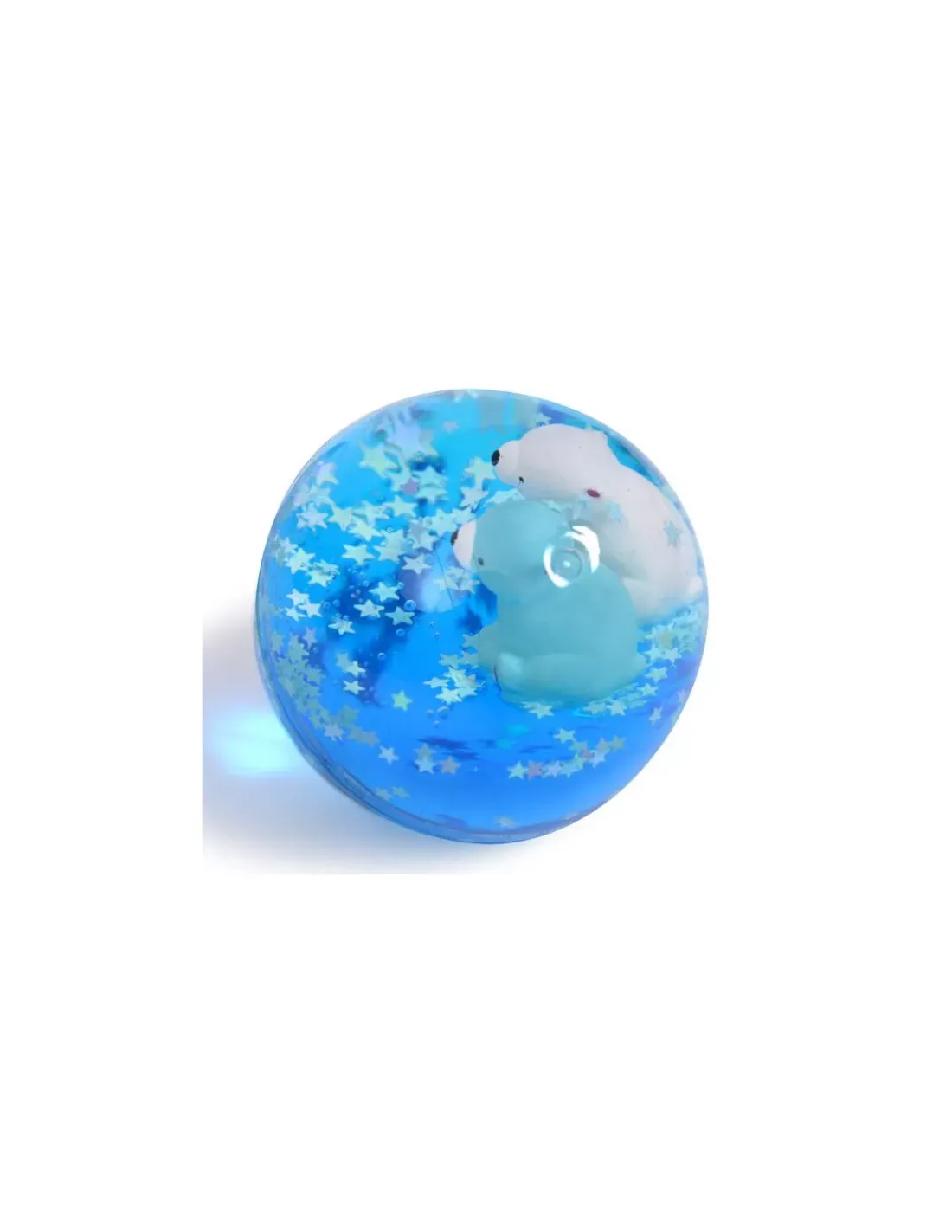 Une grosse balle rebondissante remplie de liquide coloré, où l’on voit un ours se baigner au milieu d’étoiles brillantes!