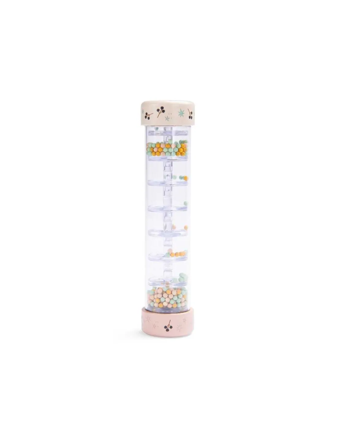 Un baton de pluie décoré des illustrations poétiques de la collection Après la pluie. Bébé s’amusera à secouer et retourner le bâton pour voir dévaler au travers des étages, les billes colorées, qui reproduisent le son apaisant de la pluie.