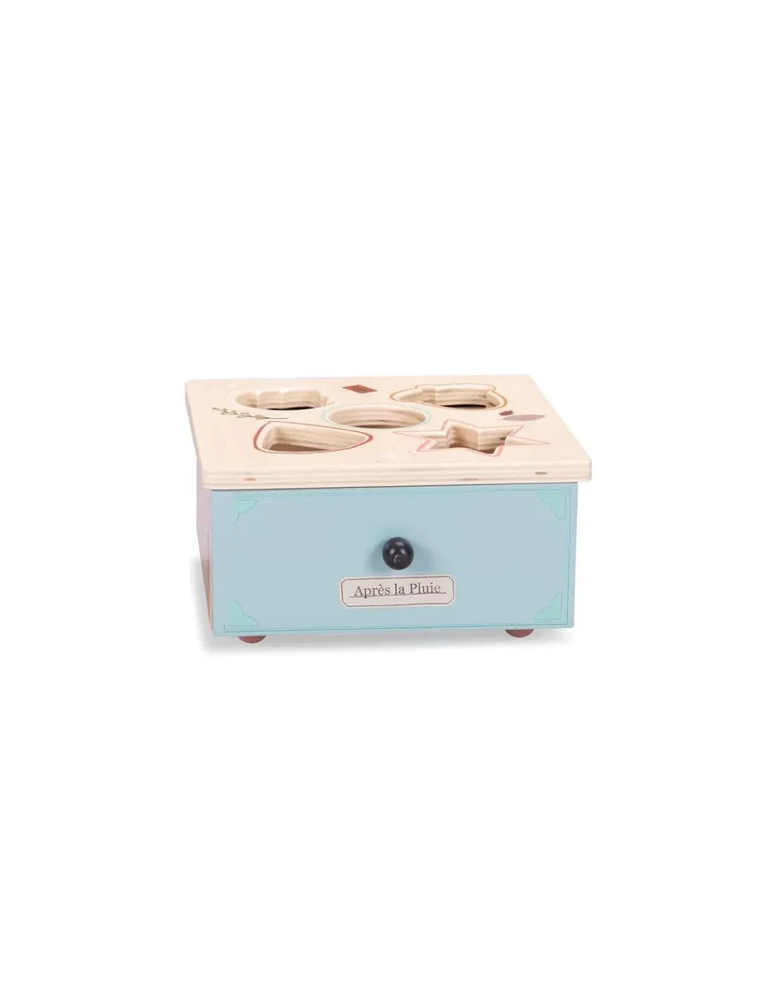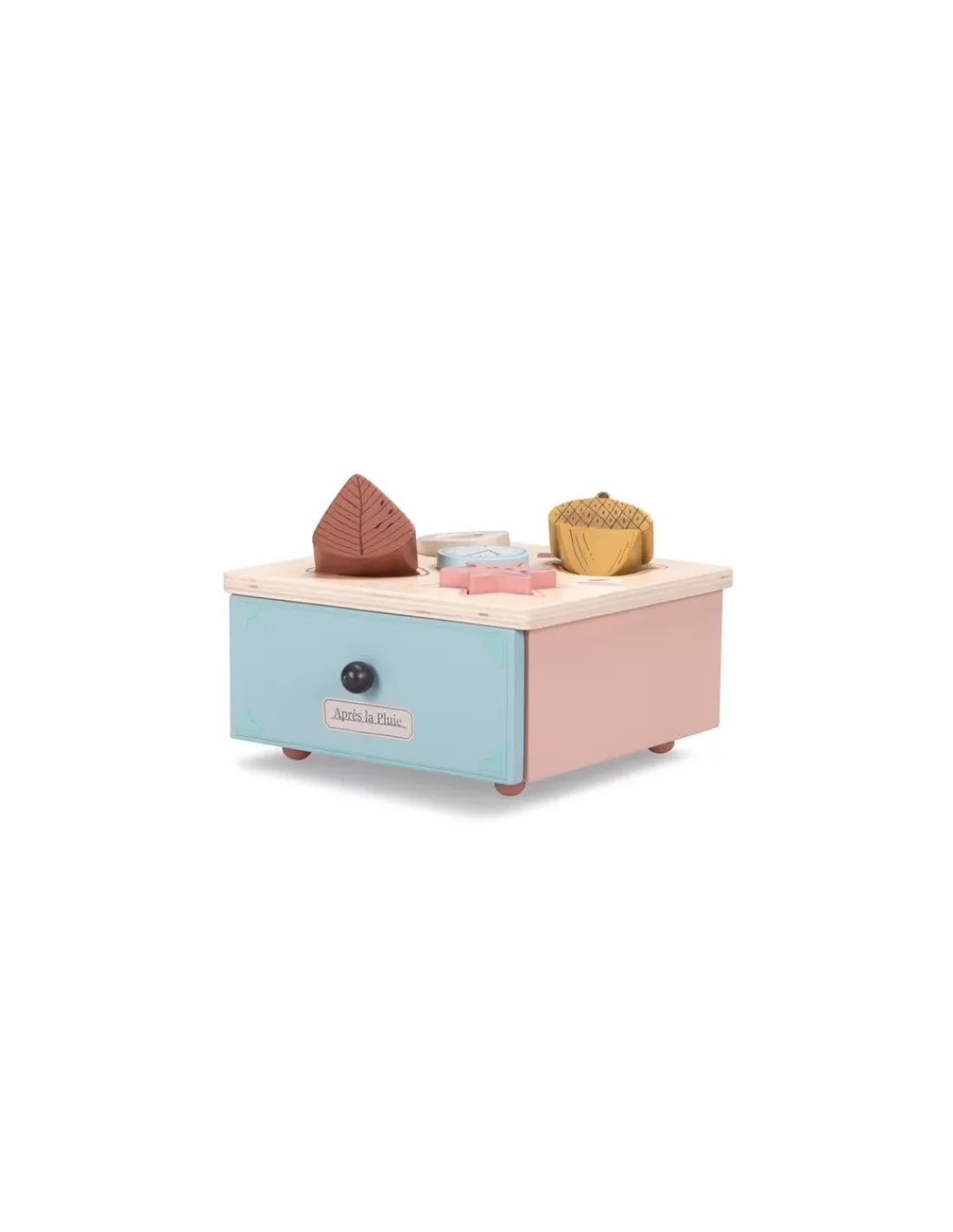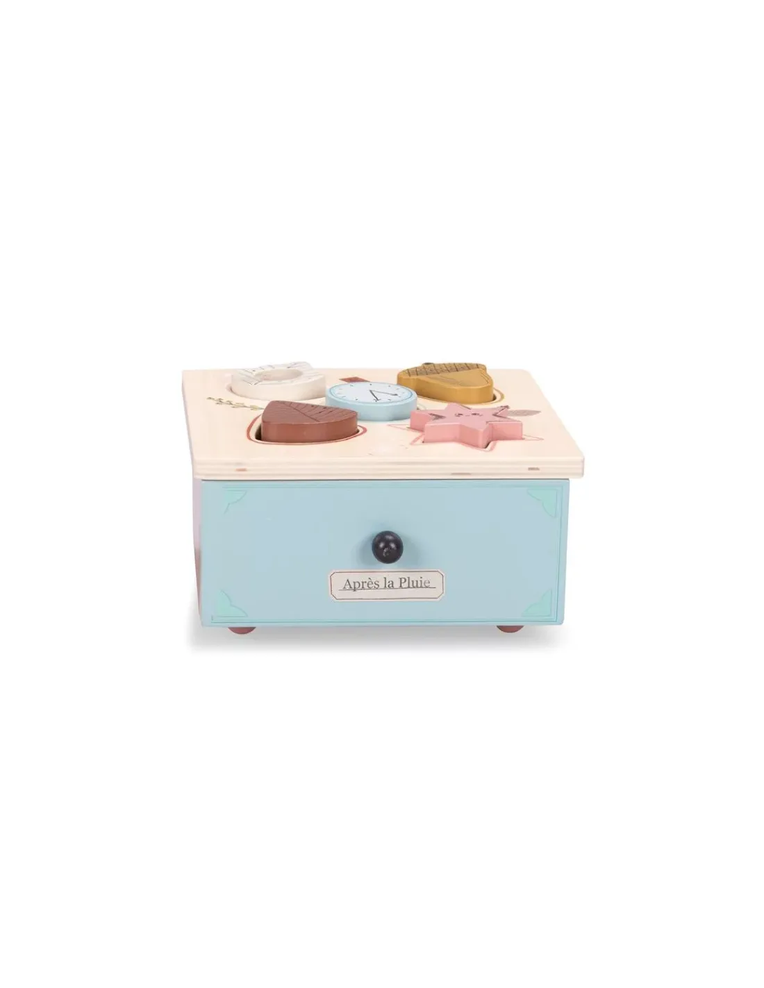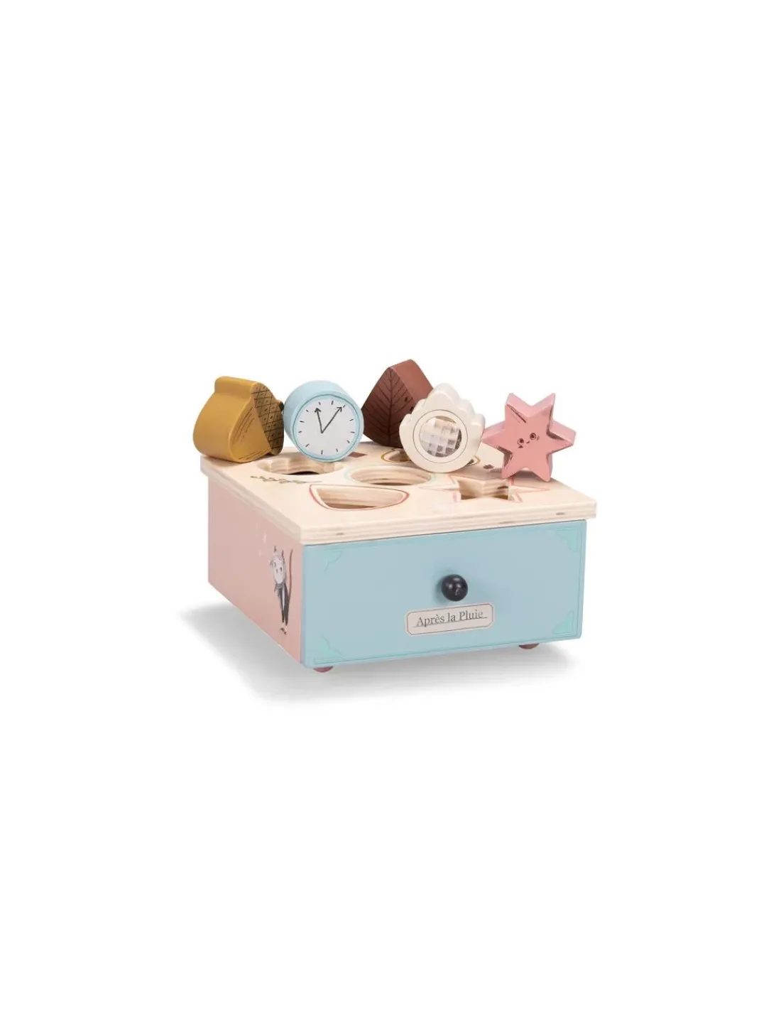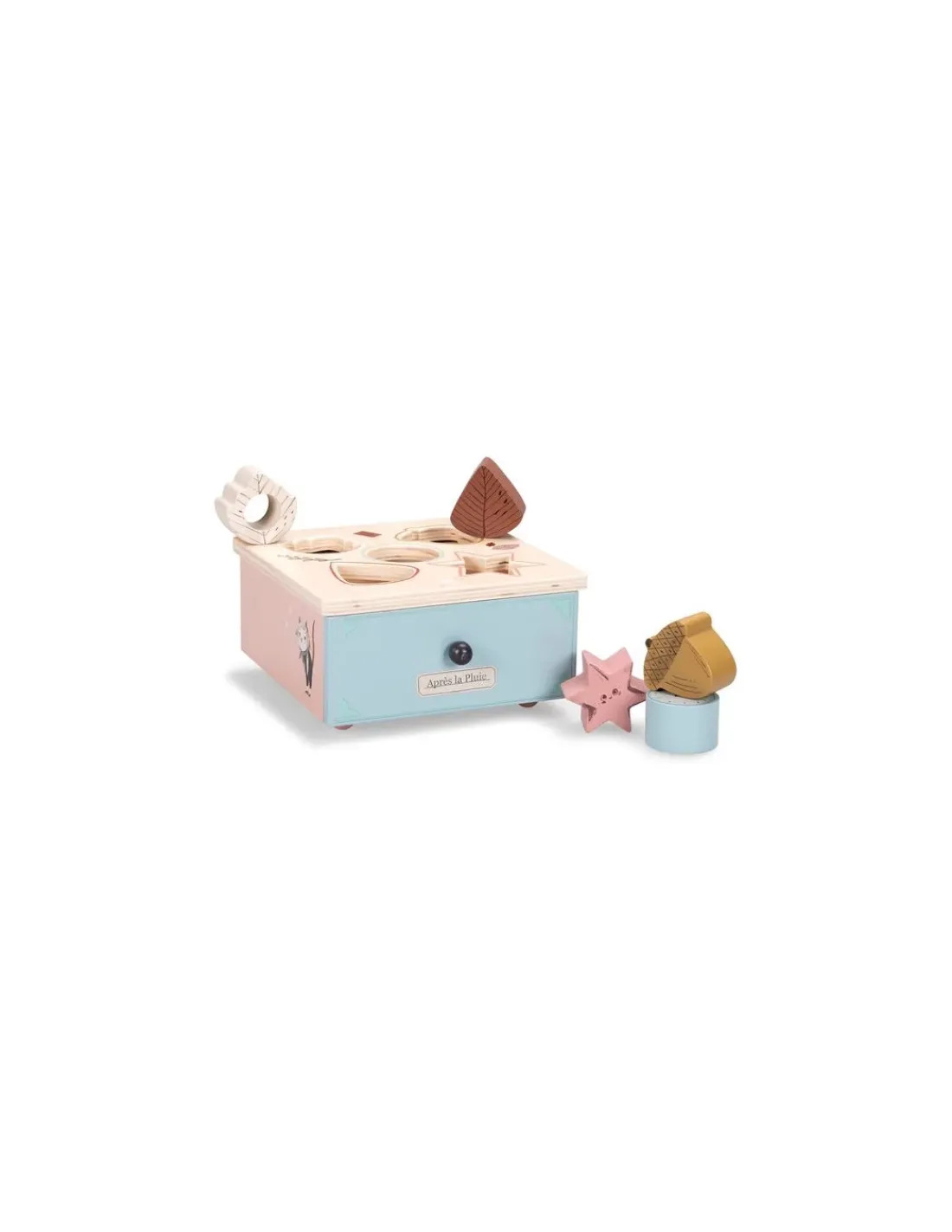 Découvrez la boite à formes de la collection Après la pluie de Moulin Roty, un jouet d’éveil en bois aux couleurs douces pour les enfants dès 10 mois.