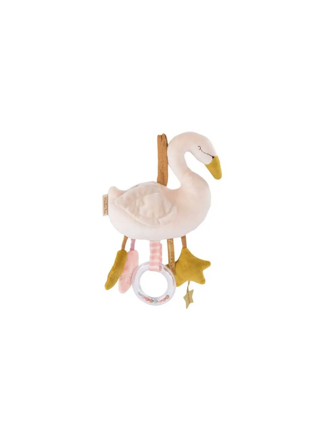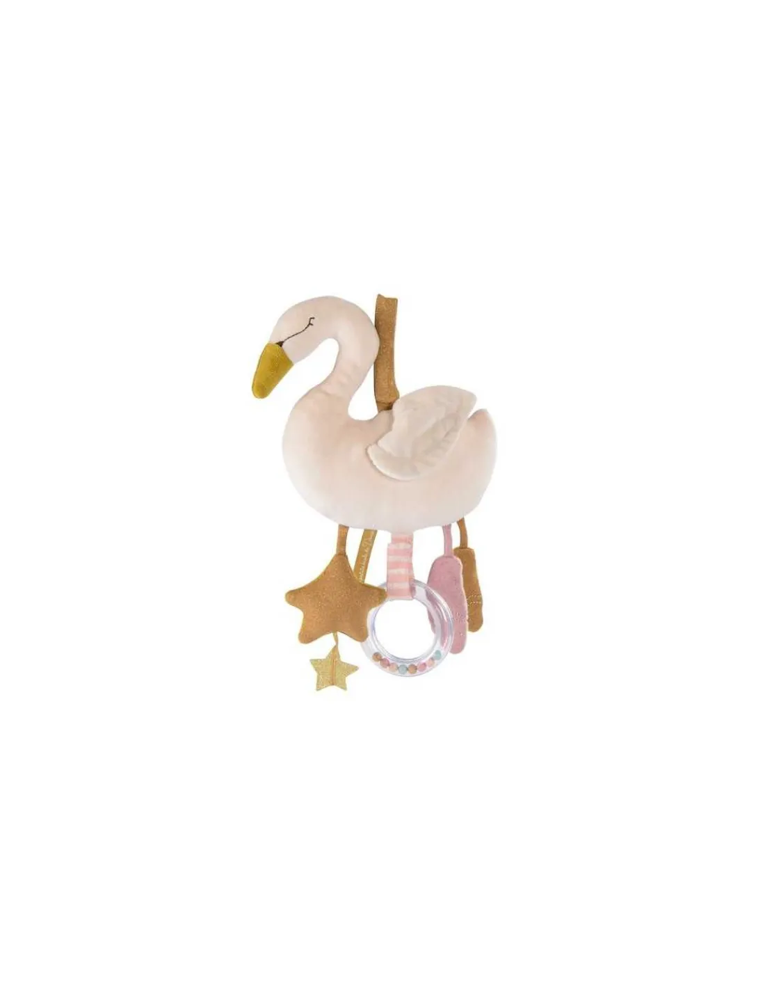 Grâce à sa languette velcro, le cygne en velours tout doux peut être suspendu partout. Il transporte avec lui plein de surprises pour amuser bébé, annneau à billes, pouët et scritch qui font du bruit. Il y a même un miroir caché sous sous aile!