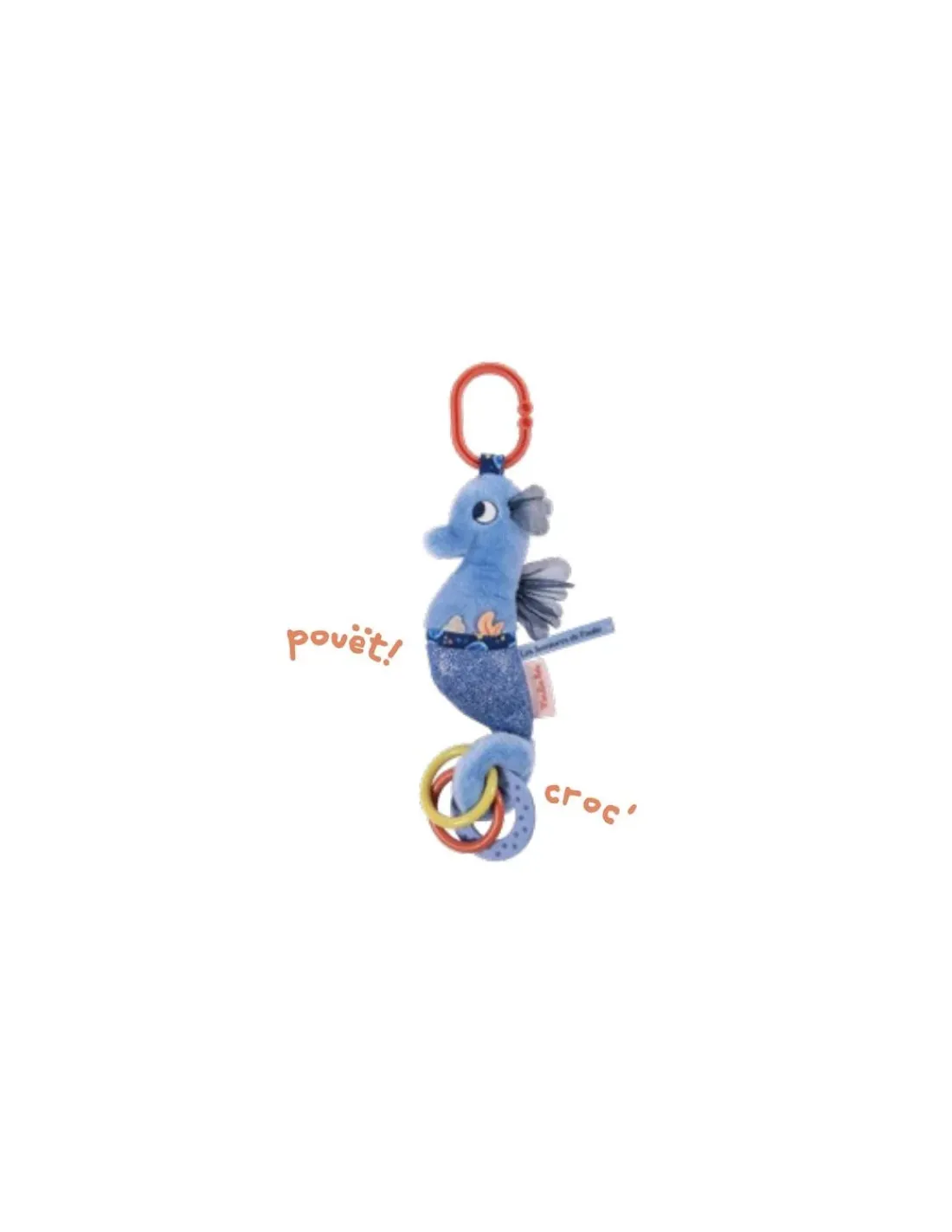 À suspendre à la poussette, à une arche d’activités ou au parc de votre enfant, cet hippocampe aux couleurs extraordinaires accompagnera votre bébé au quotidien et n’en finira pas de l’étonner avec ses nombreuses activités : pouët, anneau à mordiller, étiquettes et tissus pailletés à attraper… Un jouet en tissu qui s’accroche partout et qui peut être complété par d’autres petites activités nomades de la collection.