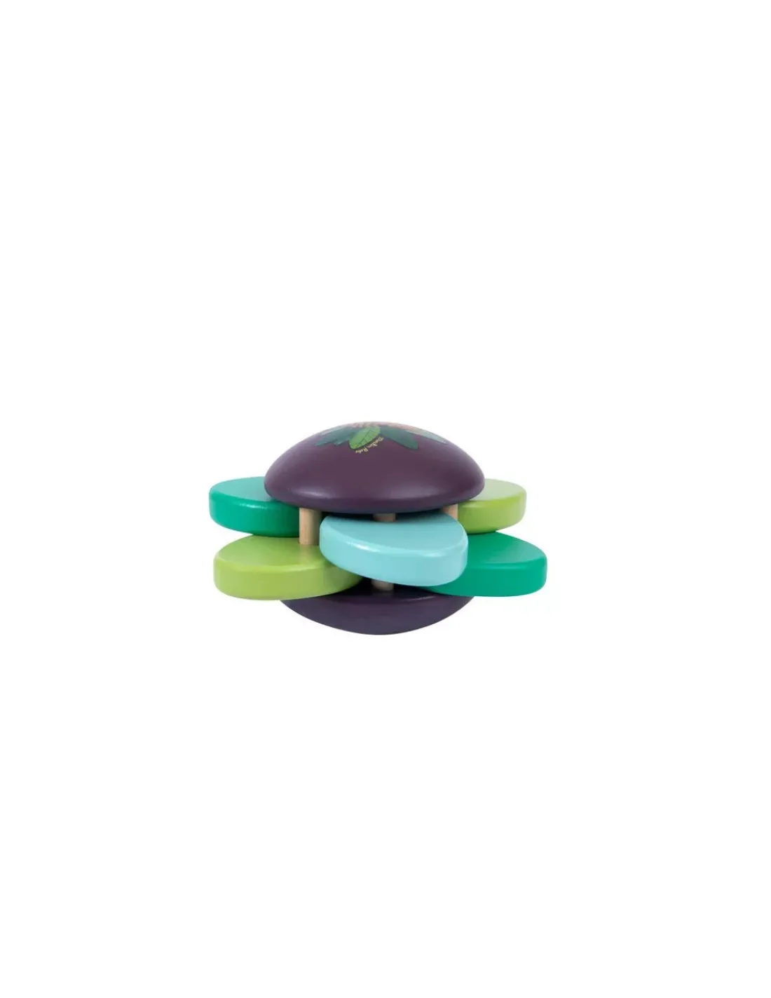 Un hochet en bois avec de jolies feuilles vertes au milieu desquelles se cache un grelot. Un petit instrument facile à attraper et à secouer par de petites mains.