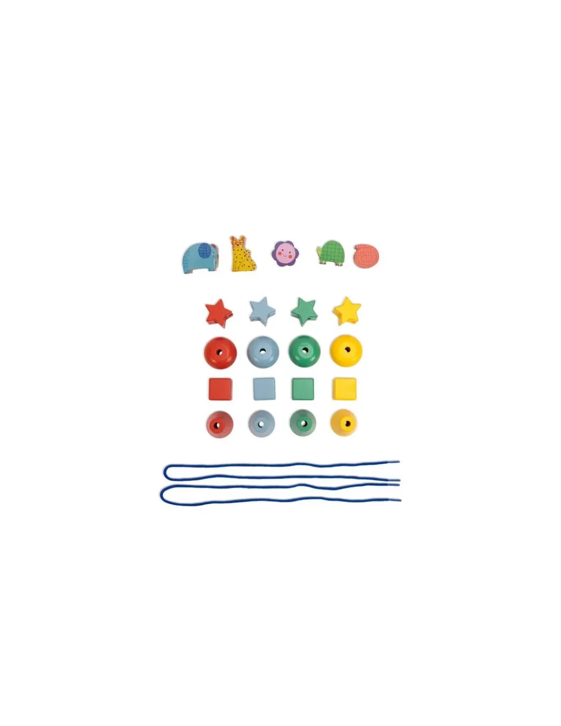 Le jeu contient 21 perles colorées en bois, 12 cartes séquence et 2 lacets.
