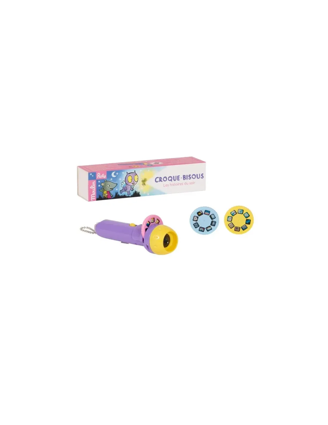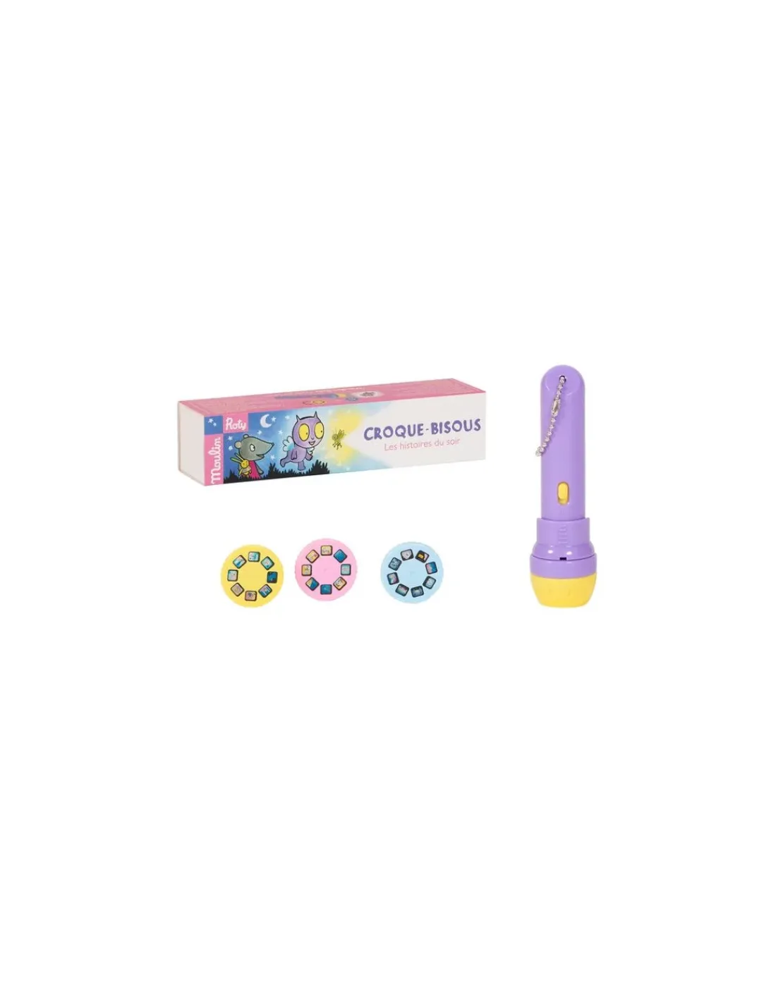 Découvrez la lampe à histoires Croque-Bisous de la collection L’école des loisirs de Moulin Roty, une lampe torche qui projette des images en couleurs, pour raconter de jolies histoires à votre enfant. 3 disques, 3 histoires originales qui vont vous emporter dans les aventures de Croque-Bisous, héros de l’école des loisirs créé par Kimiko.