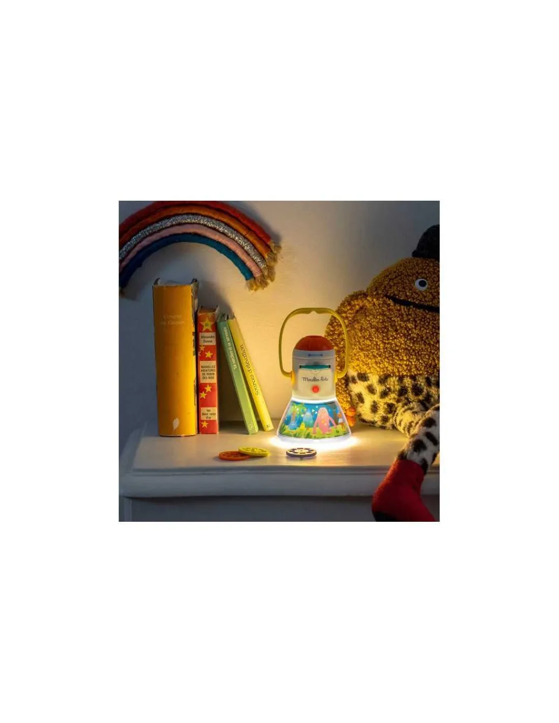 Découvrez la lanterne 3-en-1 à la fois projecteur d’histoires, d’ombres et veilleuse. 32 images à projeter pour développer l’imaginaire et se raconter de jolies histoires autour de l’univers des Schmouks. La fonction veilleuse s’éteint après 15 min.