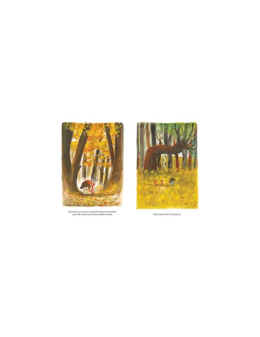 Poc et moi, on aime bien s’asseoir sur la vieille souche pour regarder les oiseaux qui volent à toute vitesse. Quand on en a marre, on prend le chemin du pré jaune, pour aller écouter notre oiseau préféré, le merle. Mais, aujourd’hui, il n’est pas là. On l’a cherché un peu partout et c’est finalement sur le sentier qu’on l’a trouvé. Il était allongé, tout tranquille. Il devait sans doute dormir. Alors on s’est assis en silence et on a attendu qu’il se réveille…