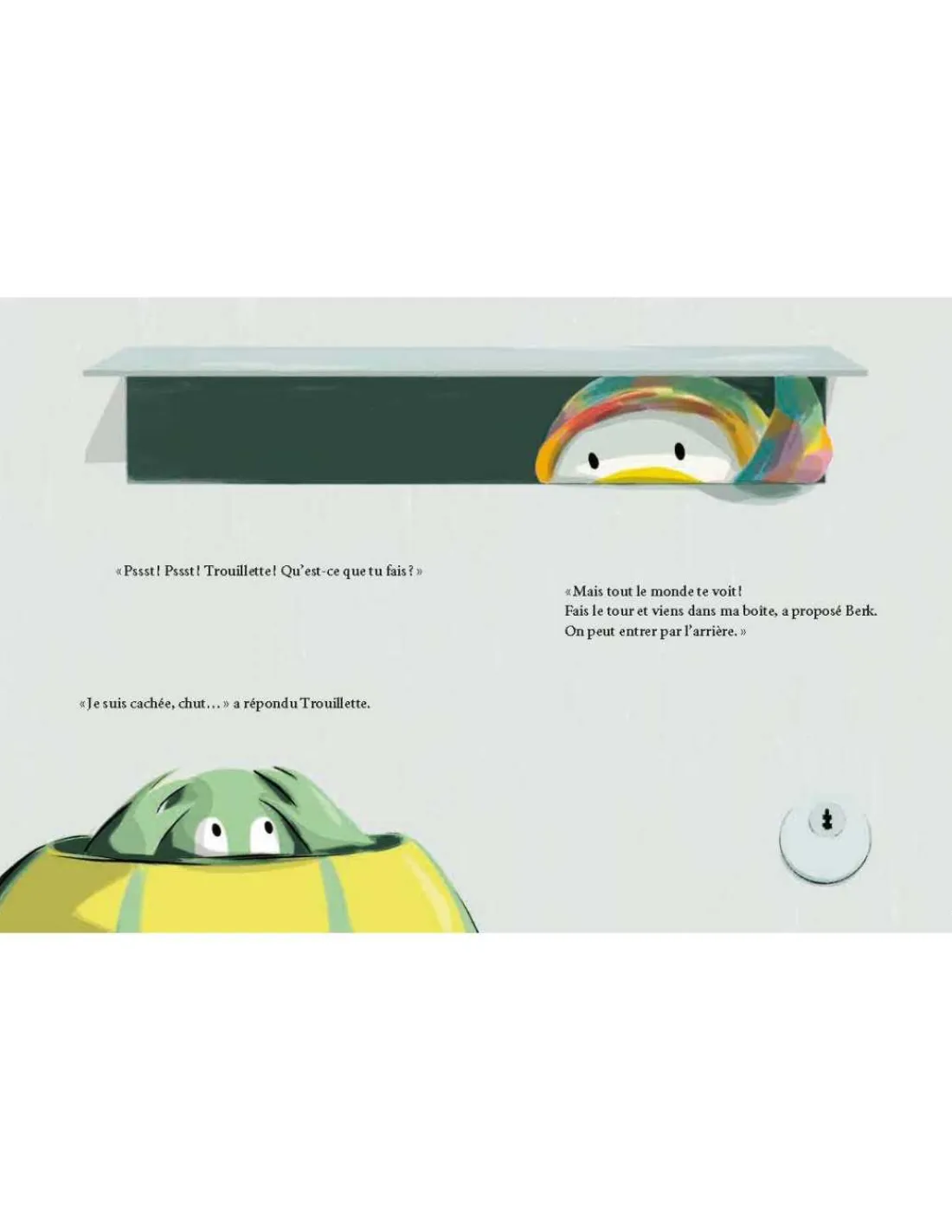 L’autre jour, un truc terrible est arrivé. Berk et ses amis jouaient à cache-cache devant la maison. Super fier de son idée, Berk s’est faufilé dans la boîte à lettres. Trouillette l’a rejoint. Mais bizarrement, il n’y avait plus aucun bruit dehors. Et impossible de ressortir de la boîte. Trouillette s’est lamentée : si les copains les avaient oubliés ?