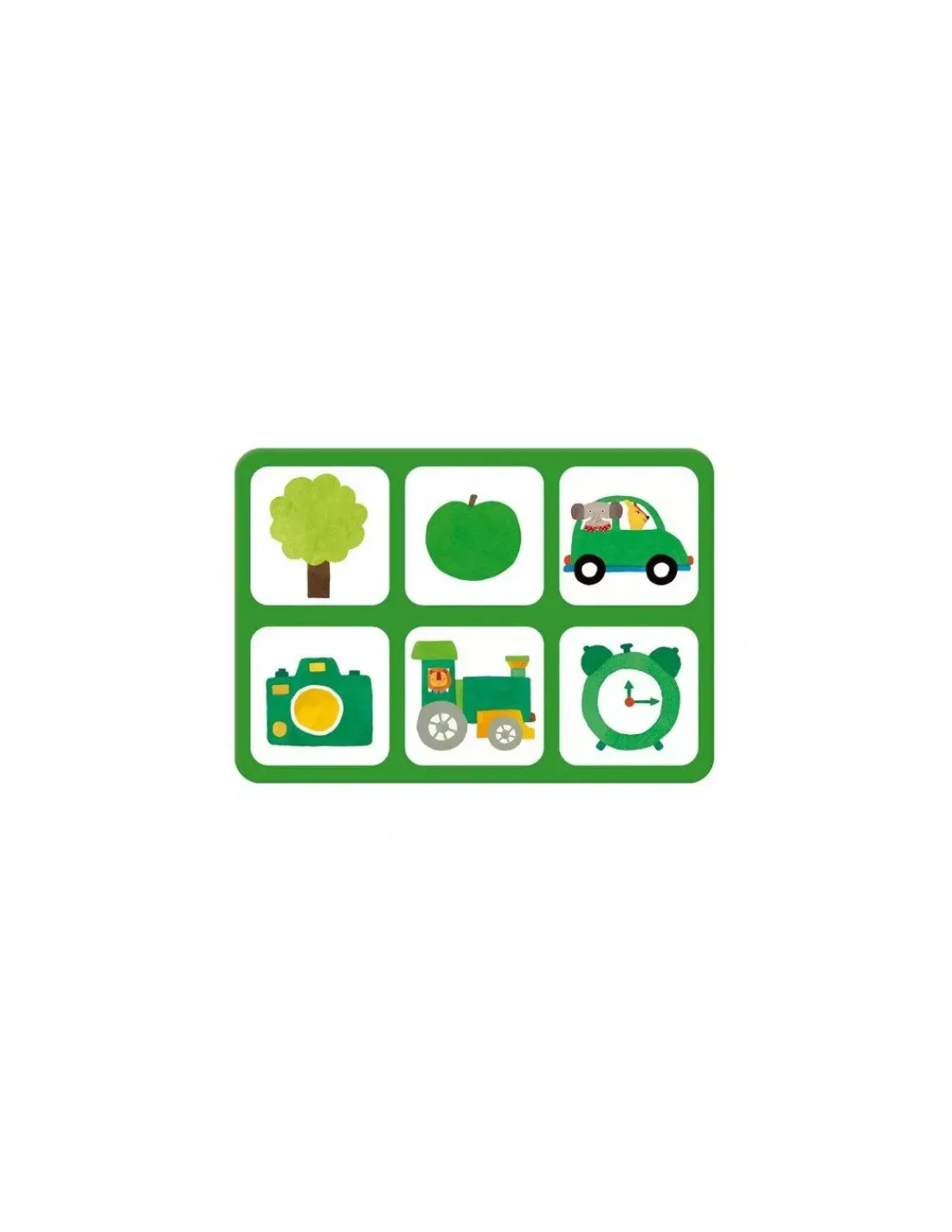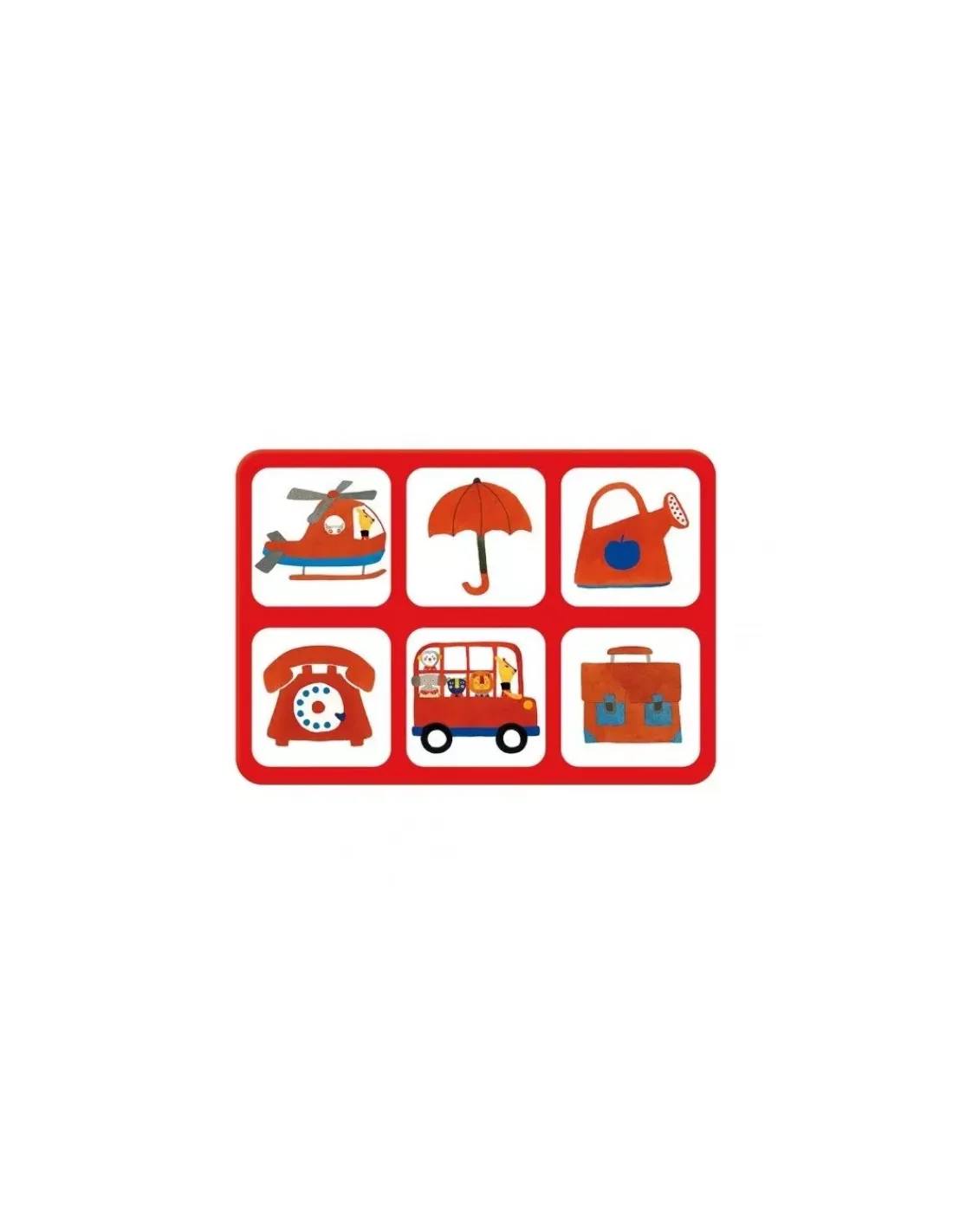 Ce jeu contient quatre planches de couleurs primaires (bleu, rouge, vert et jaune), aux illustrations simples d’objets du quotidien, traité comme un imagier, reprenant l’association graphique de la gamme.