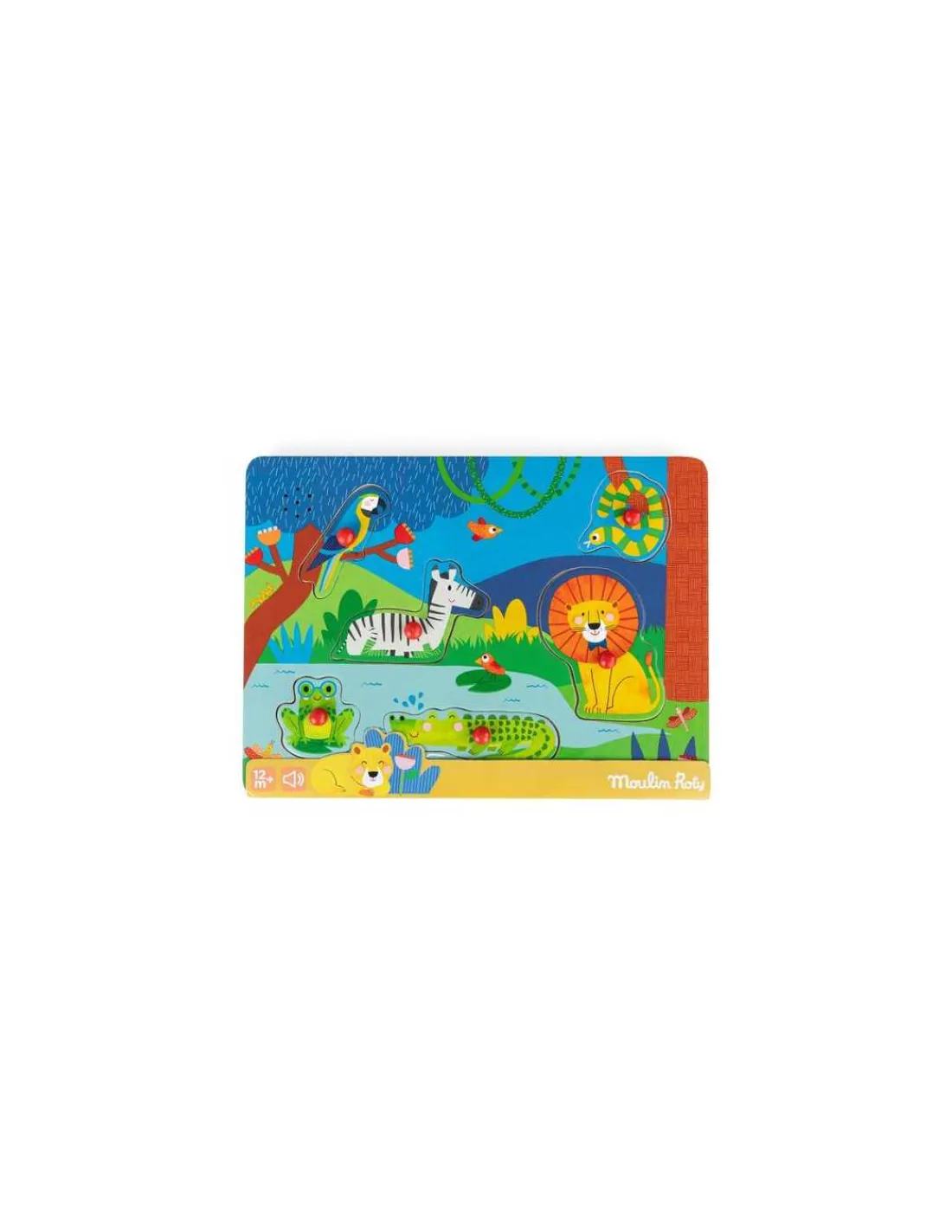 Découvrez le puzzle sonore animaux en bois de la collection Les toupitis de Moulin Roty, un puzzle sonore en bois de 6 pièces avec des boutons afin que les petites mains puissent le réaliser facilement à partir de 1 an.